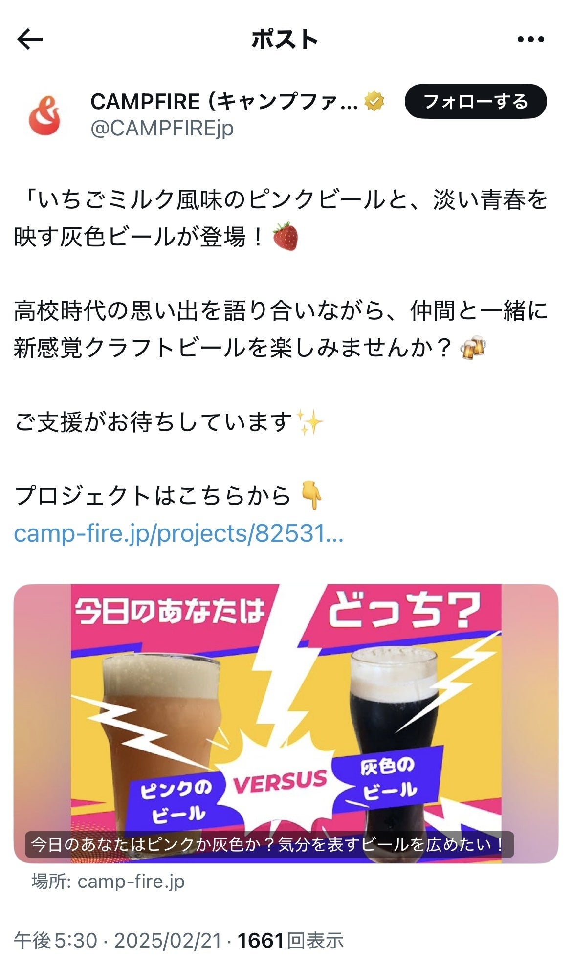 【驚愕!感謝!】ピンクvs灰色のビールが意外と人気!開始10時間で46%を達成いたしております!