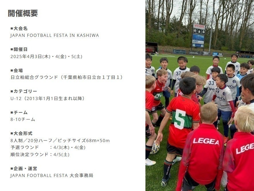 2025年4月、新たなU-12国際大会として「JAPAN FOOTBALL FESTA IN KASHIWA」を開催することが決定しました。