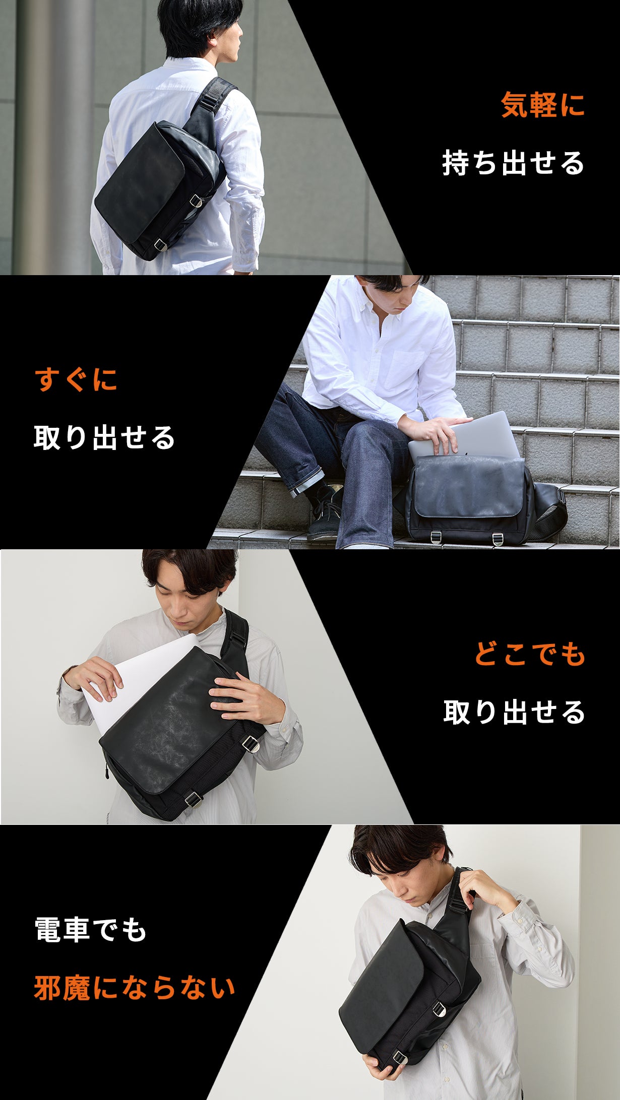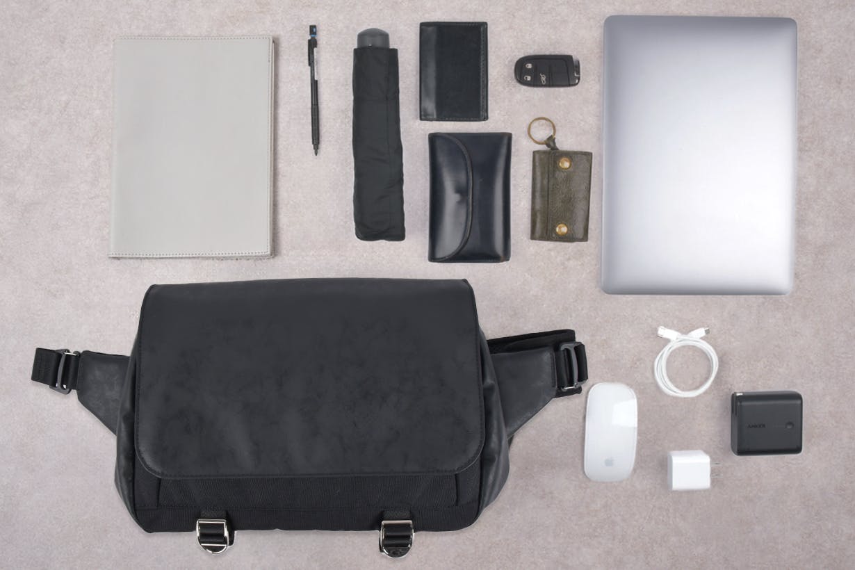 デザイナーの私自身、PCを持ち出す際に普段使わない大きなリュックへ荷物を移し替えて、その大きなリュックを背負って満員電車に乗り通勤することを億劫に感じていましたが、身軽に持てるスリングバッグならこれらの不満も改善されることに気づきました。