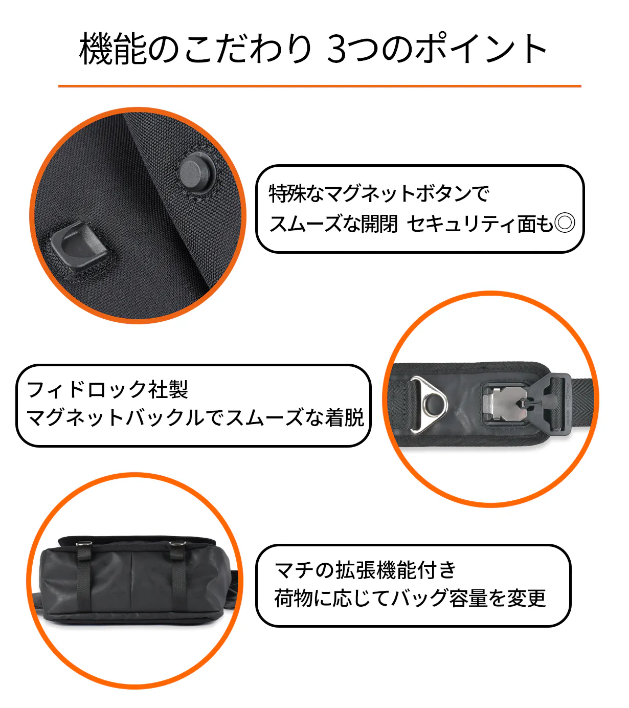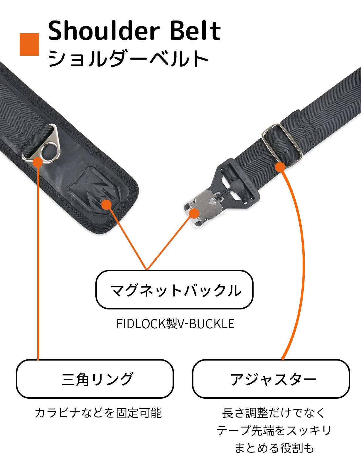 ショルダーベルトには、ドイツのパーツブランド【FIDLOCK】のマグネットバックルを使用しています。