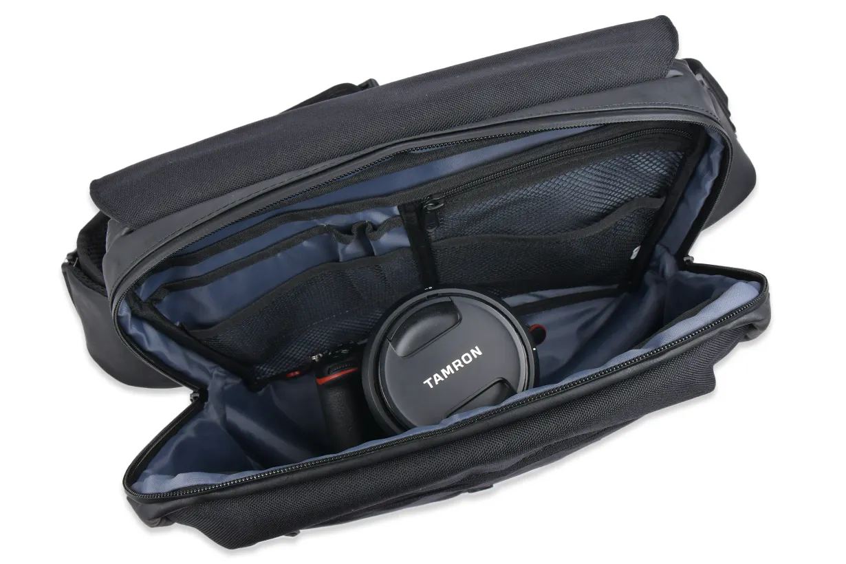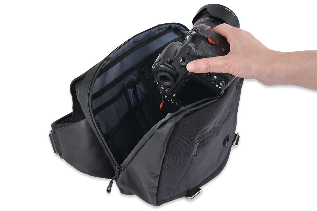 マチを広げれば一眼レフカメラも収納可能です。