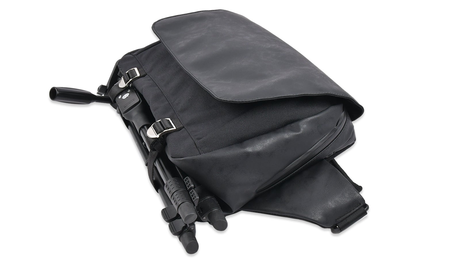 拡張用の底マチのベルト部分には、三脚や折り畳み傘を固定することができます。