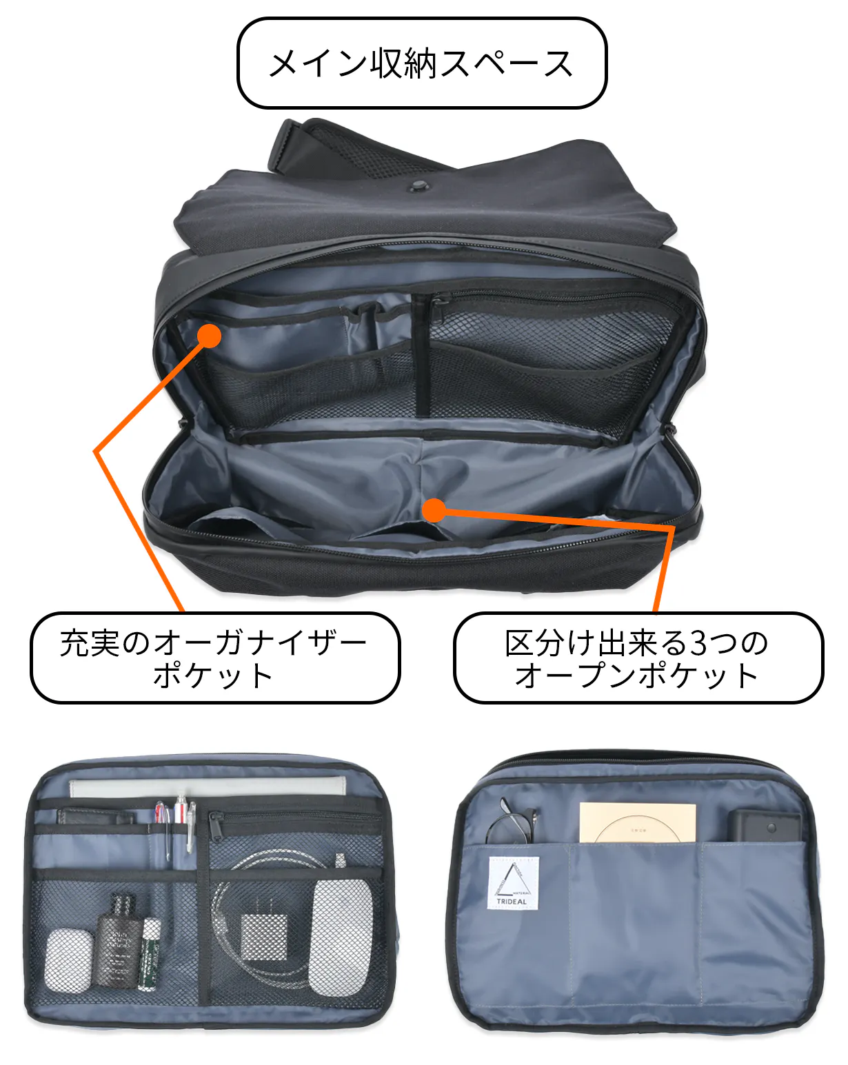 拡張ができることで、普段は必要最低限の荷物で身軽に出かけて、荷物が増えたときも拡張することで対応ができるので、いつでもこのバッグ一つで出掛けられる設計になっています。