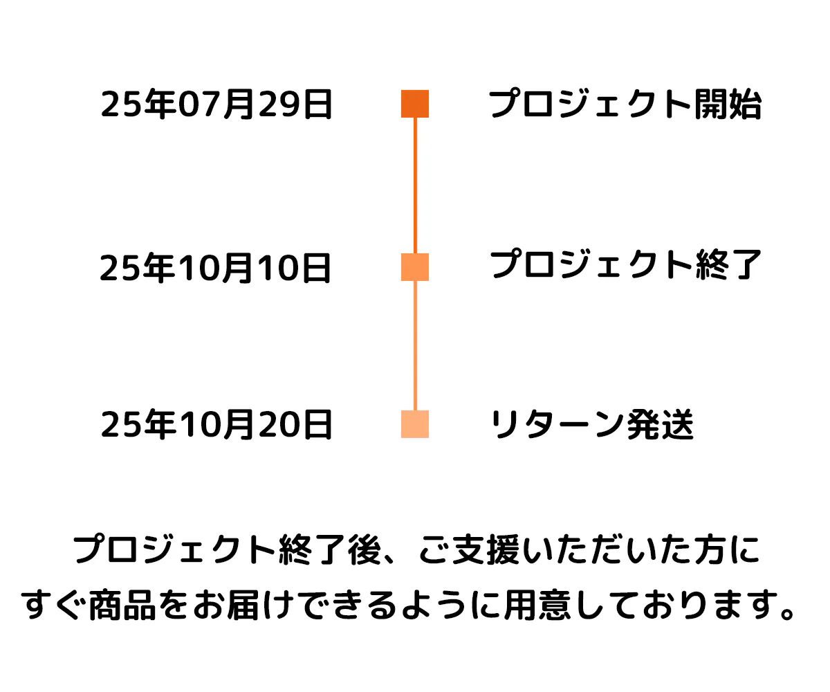 ●引渡し時期: 各リターン詳細に記載の発送予定月を引き渡し時期とします。但し、開発・生産状況によって遅れが生じる場合がありますのでその際は当プロジェクトページ内の「活動報告」または購入者へのメール等で連絡します。
