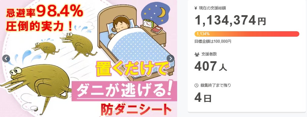 【置くだけ!ダニが逃げる 防ダニシート】プロジェクトがラスト4日を迎え、