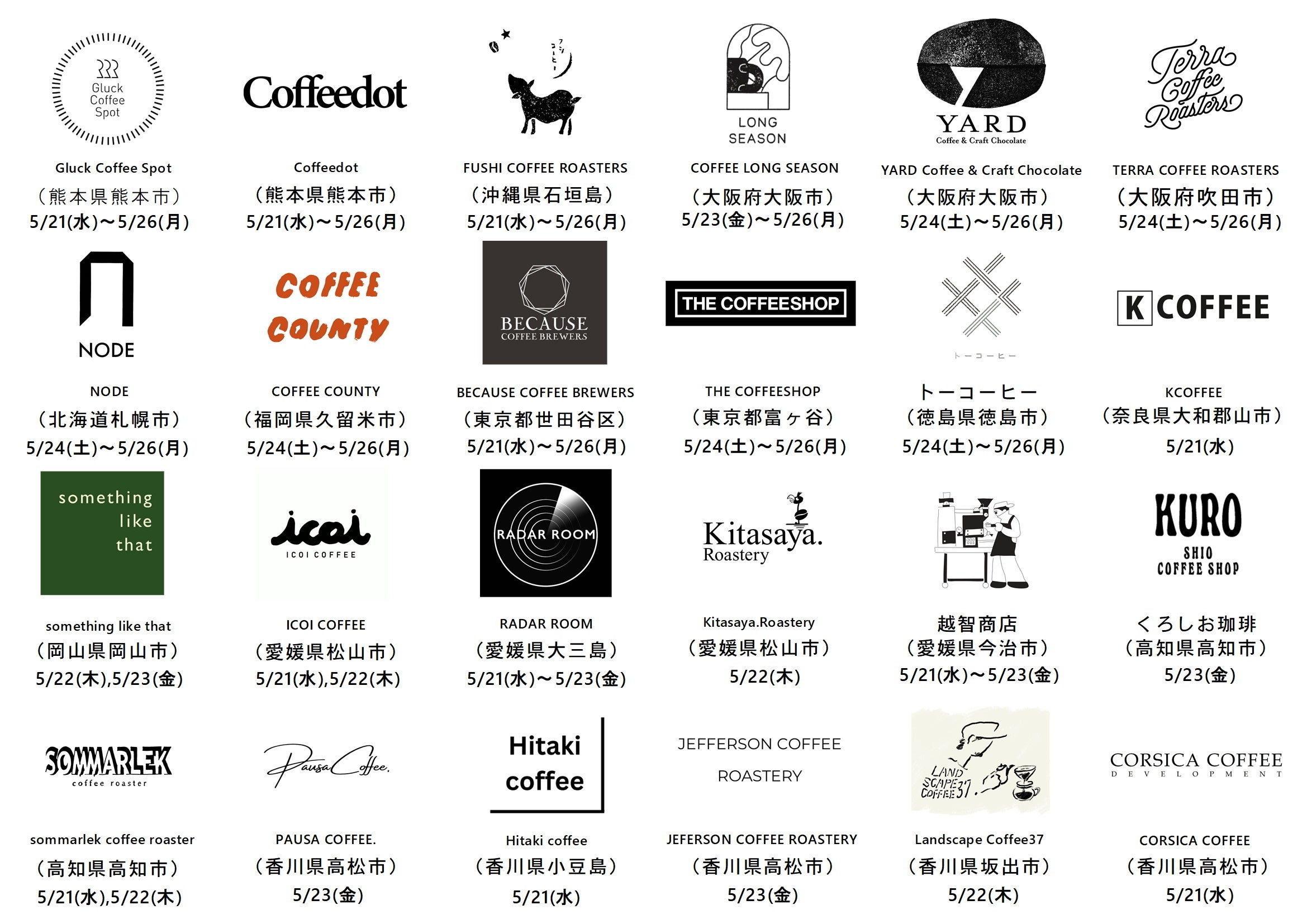 2025/04/09 19:005/21-26 KAGAWA COFFEE FES.の全出店店舗スケジュールが完成しました!※3/7一部出店者のスケジュールを修正いたしました!北は北海道、南は沖縄まで、素晴らしいコーヒーロースターさん全24店舗が日替わりでローテーションしながら香川県高松市の高松三越に集結いたします。ぜひご期待ください!出店店舗一覧(北から順に)NODE(北海道札幌市)BECAUSE COFFEE BREWERS(東京都世田谷区)THE COFFEE SHOP(東京都富ヶ谷)TERRA COFFEE ROASTERS(大阪市吹田市)COFFEE LONG SEASON(大阪府大阪市)YARD Coffee & Craft Chocolate(大阪府大阪市)K COFFEE(奈良県大和郡山市)something like that(岡山県岡山市)CORSICA COFFEE DEVELOPMENT(香川県高松市)Hitaki Coffee(香川県小豆島)JEFERSON COFFEE ROASTERY(香川県高松市)Landscape Coffee37(香川県坂出市)PAUSA COFFEE.(香川県高松市)ICOI COFFEE(愛媛県松山市)Kitasaya. Roastery(愛媛県松山市)越智商店(愛媛県今治市)RADAR ROOM(愛媛県大三島)トーコーヒー(徳島県徳島市)sommarlek coffee roaster(高知県高知市)くろしお珈琲(高知県高知市)COFFEE COUNTY(福岡県久留米市)Gluck Coffee Spot(熊本県熊本市)Coffeedot(熊本県熊本市)FUSHI COFFEE ROASTERS(沖縄県石垣島) もっと見る