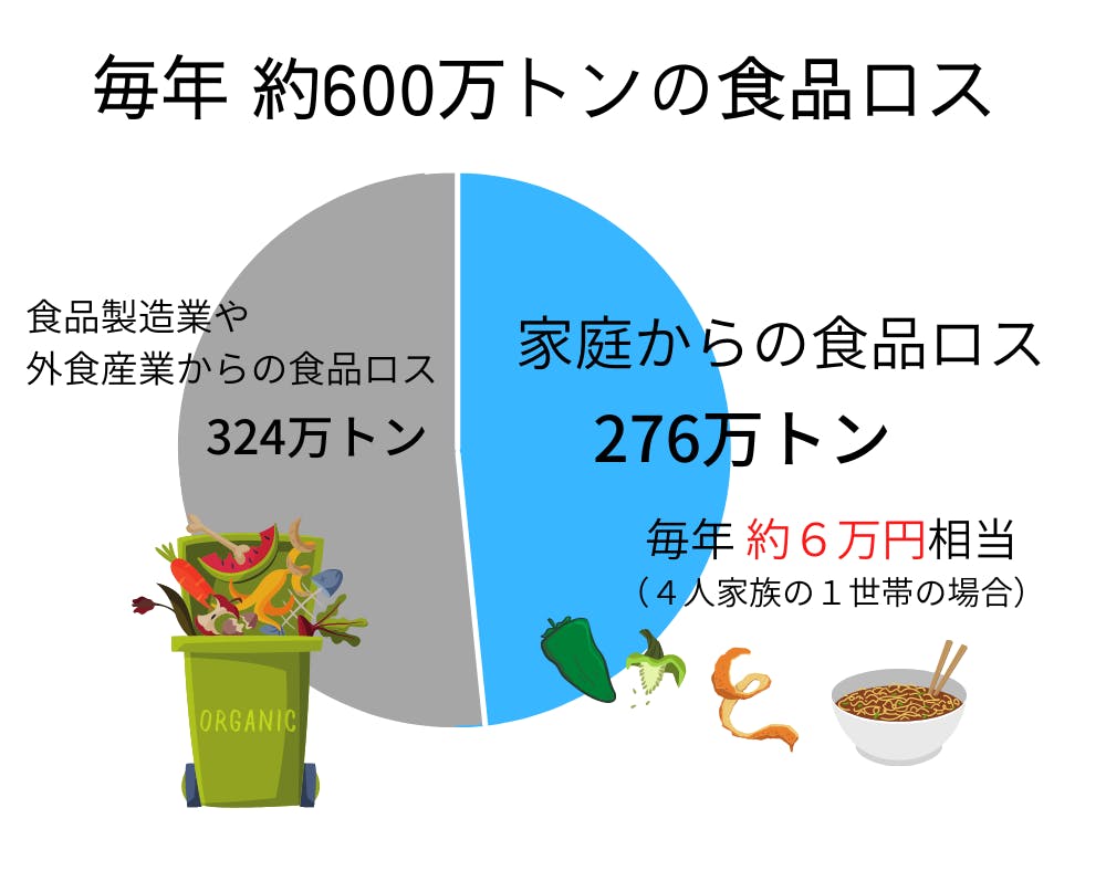 日本ではこの食品ロスが年間約600万トン発生しています。