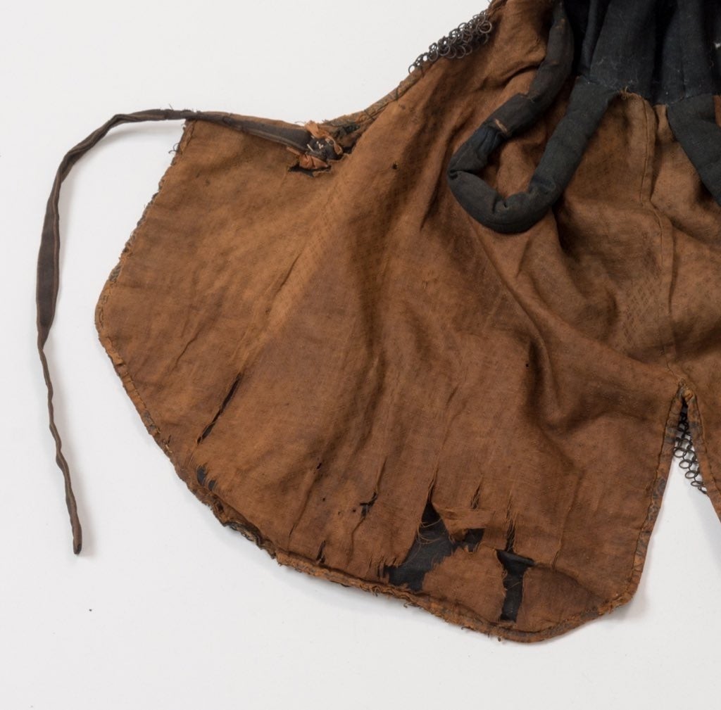 こちらの鎖帷子も裏地布部分の劣化が進み、籠手の鎖地と裏地とをつなぐ部分はほつれ、ところどころ分離しています。頭に当たる鉢裏部分は劣化により剥がれてしまっている状態で、現在資料館では公開をとりやめている状況です。