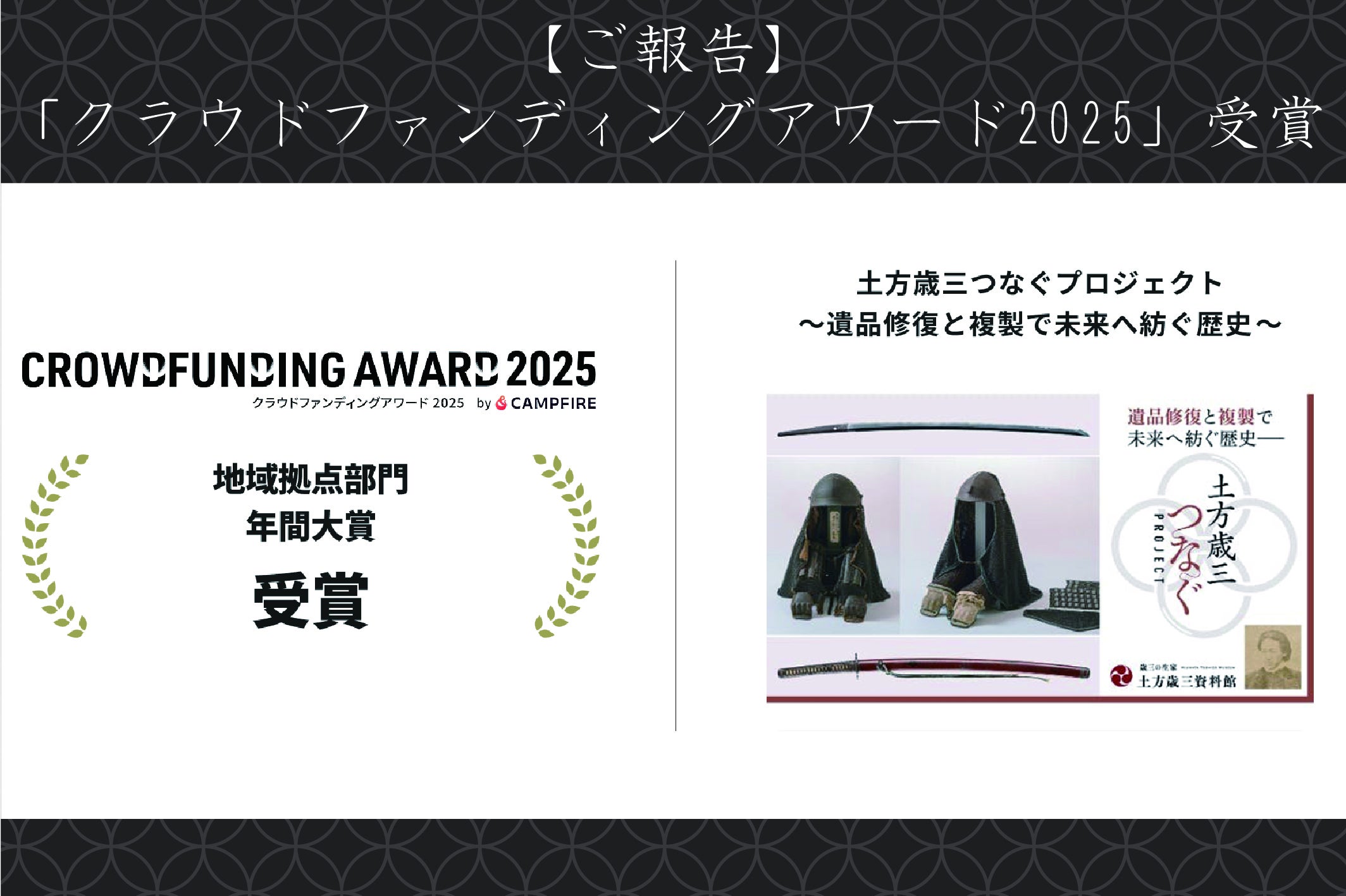 2025/12/18 11:00皆さまこんにちは、土方歳三つなぐプロジェクト実行委員会です。この度、『土方歳三つなぐプロジェクト』が「クラウドファンディングアワード2025」【地域拠点部門・年間大賞/未来への架け橋賞】を受賞いたしました。発表サイト:https://camp-fire.jp/awards本企画は、目標金額の達成以上に、5,488名もの皆さまからご支援を賜ったことに大きな意義があると感じております。土方歳三という人物を未来へつなぐため、多くの方が想いを寄せてくださった証であり、運営一同、深く感謝申し上げます。また、関係各所の皆さまのご協力なくして、本プロジェクトは実現しませんでした。ここに改めて厚く御礼申し上げます。今回の受賞を励みに、今後も、歴史と文化の継承に努めてまいります。今後とも本プロジェクトへの変わらぬご支援とご厚情を賜りますよう、心よりお願い申し上げます。 もっと見る