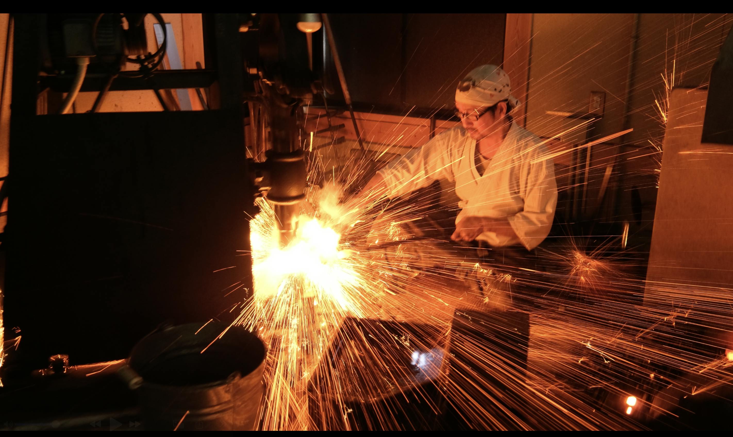 十分に熱した鋼をハンマーで打ち延ばし、半分に折り返して再び叩く——。