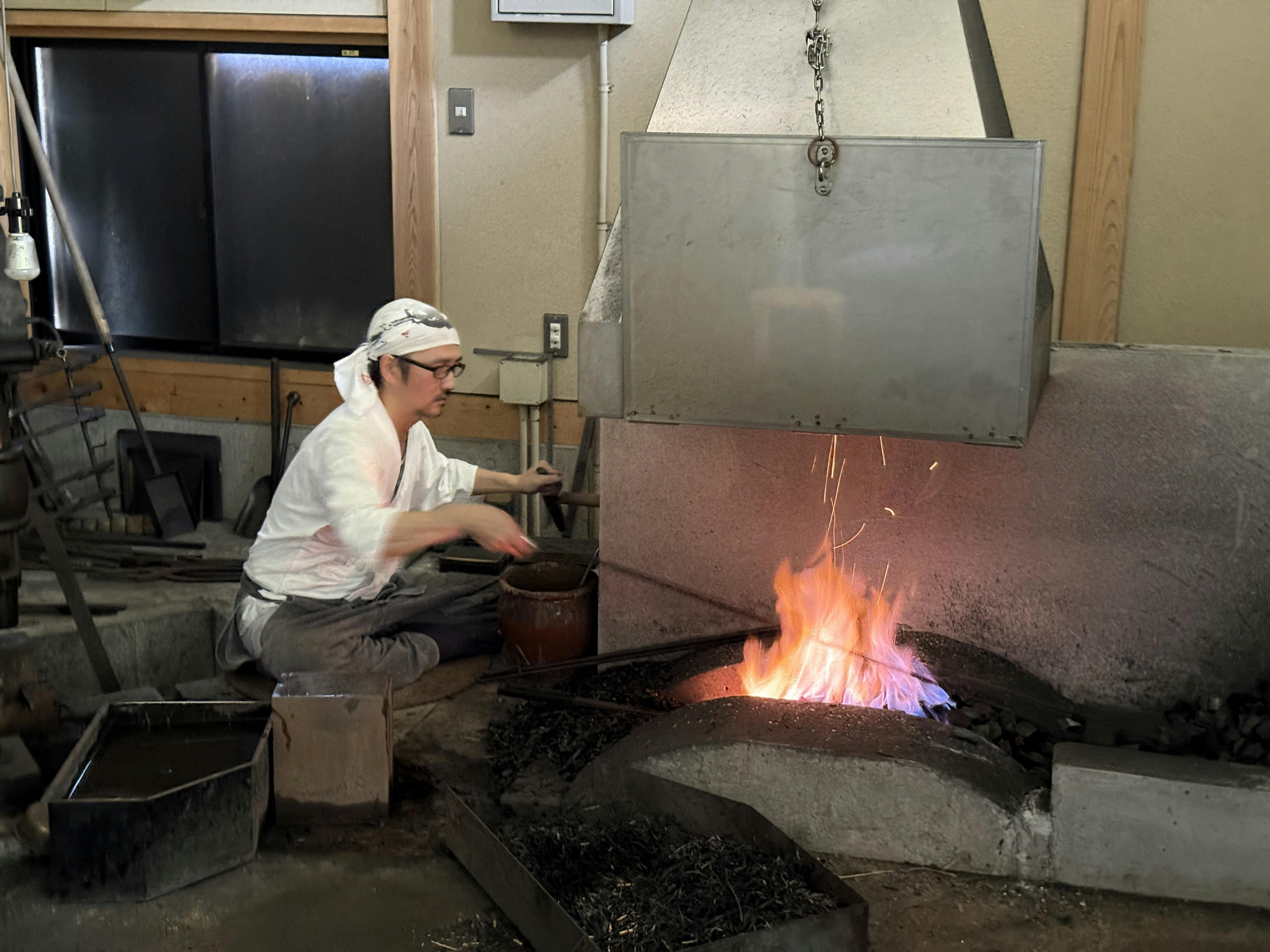 河内さんは、炎の色や火花の具合を見極め、鞴(ふいご)で風を送りながら温度を細かく調整されていました。