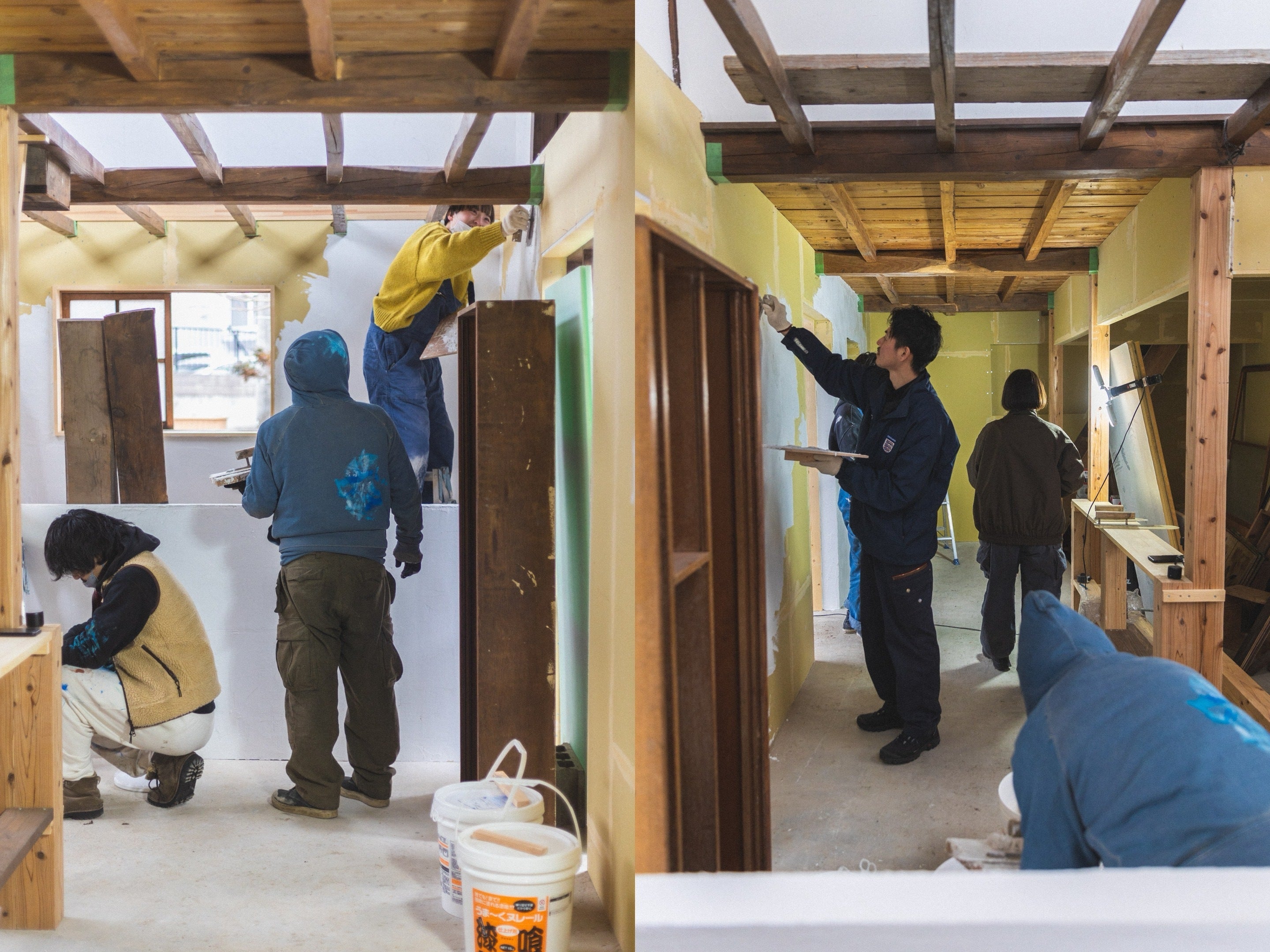 SNSを通して漆喰塗りのお手伝いを募集して、冬の大雪の中みんなで漆喰塗りをしました。