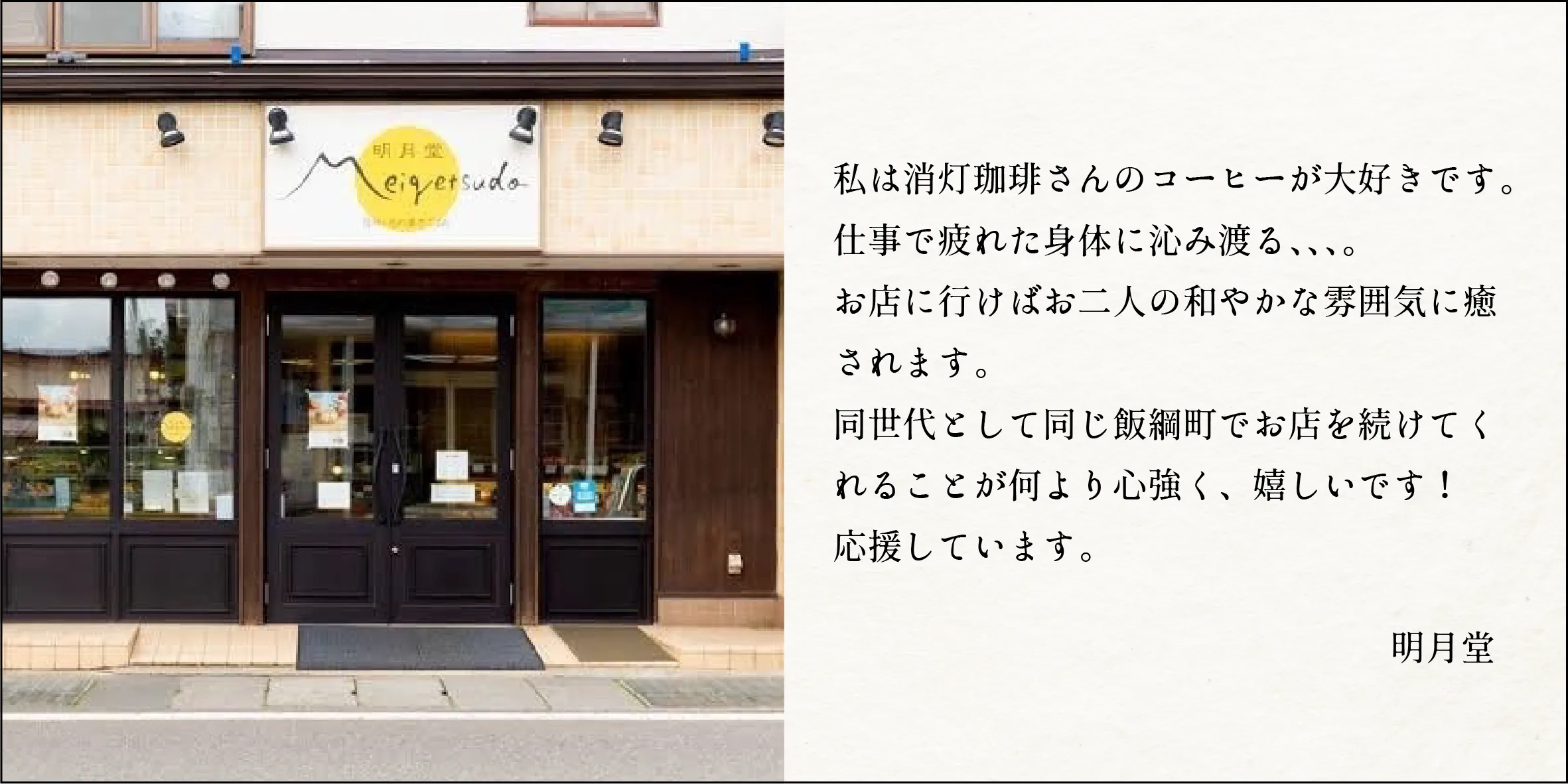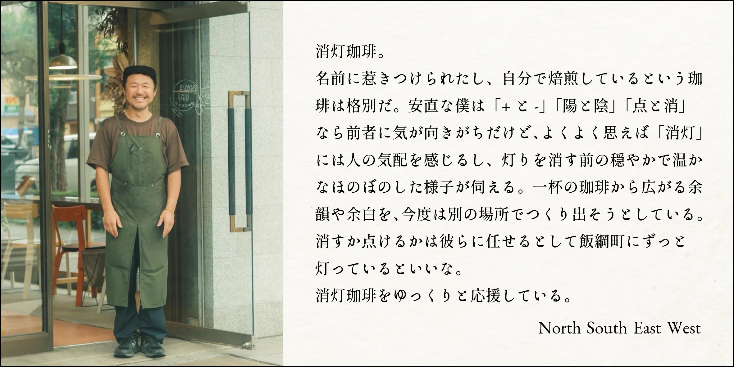 寂しさを抱えてたり、喋らなくとも誰かがいるという安心感の中で一人の時間を過ごしたり、大切な人と過ごしたり、そんな心休まるとまり木のような場所が、消灯珈琲なんだと思います。