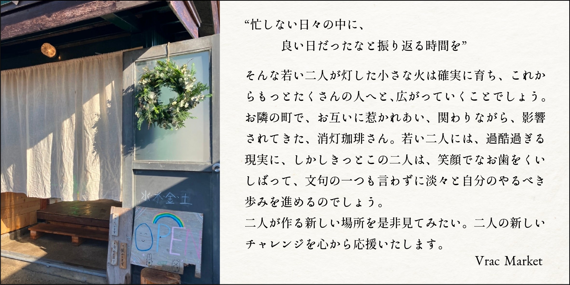 自分たちの力で一生懸命作り上げた第一章の消灯珈琲は幕を下ろしましたが、多くの励ましや応援で背中を押してもらい胸を張って第二章に向かっていくことができます。ぜひ移店した先でお会いする日が来ましたら、たくさんのお礼を伝えさせてください。