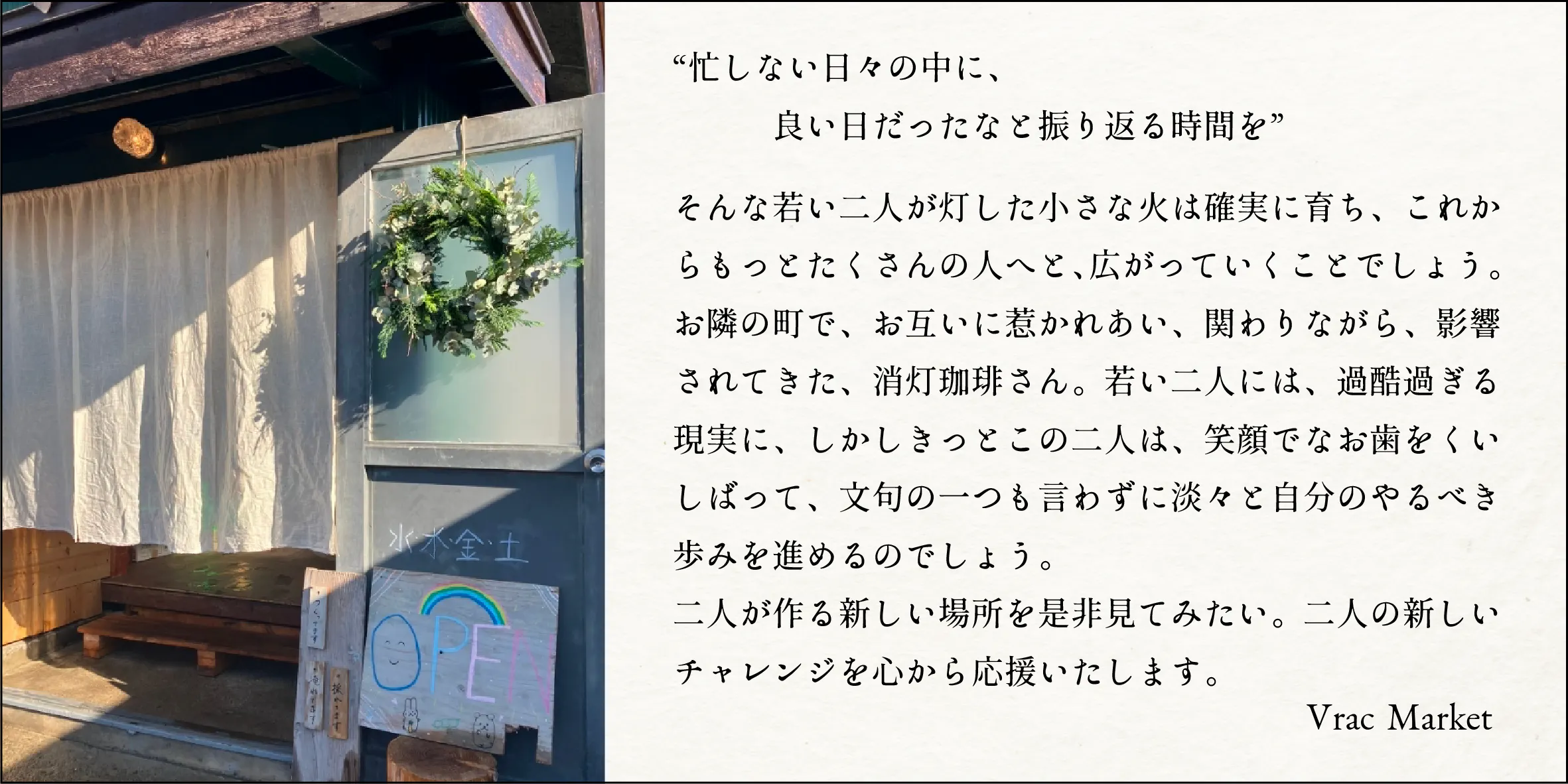今回「立ち退き」という形で現在の愛着のある店舗は無くなってしまいますが、1年間の限られた営業だったからこそ得られる経験がたくさんありました。訪れる人がこの町に来るまでに何を思うのか、町で暮らす人たちはどんな場所を求めているのか。私たち自身がこの場所で営み生活をして実感することと合わせて、自分たちのつくるお店の在り方をよくよく考えさせられました。