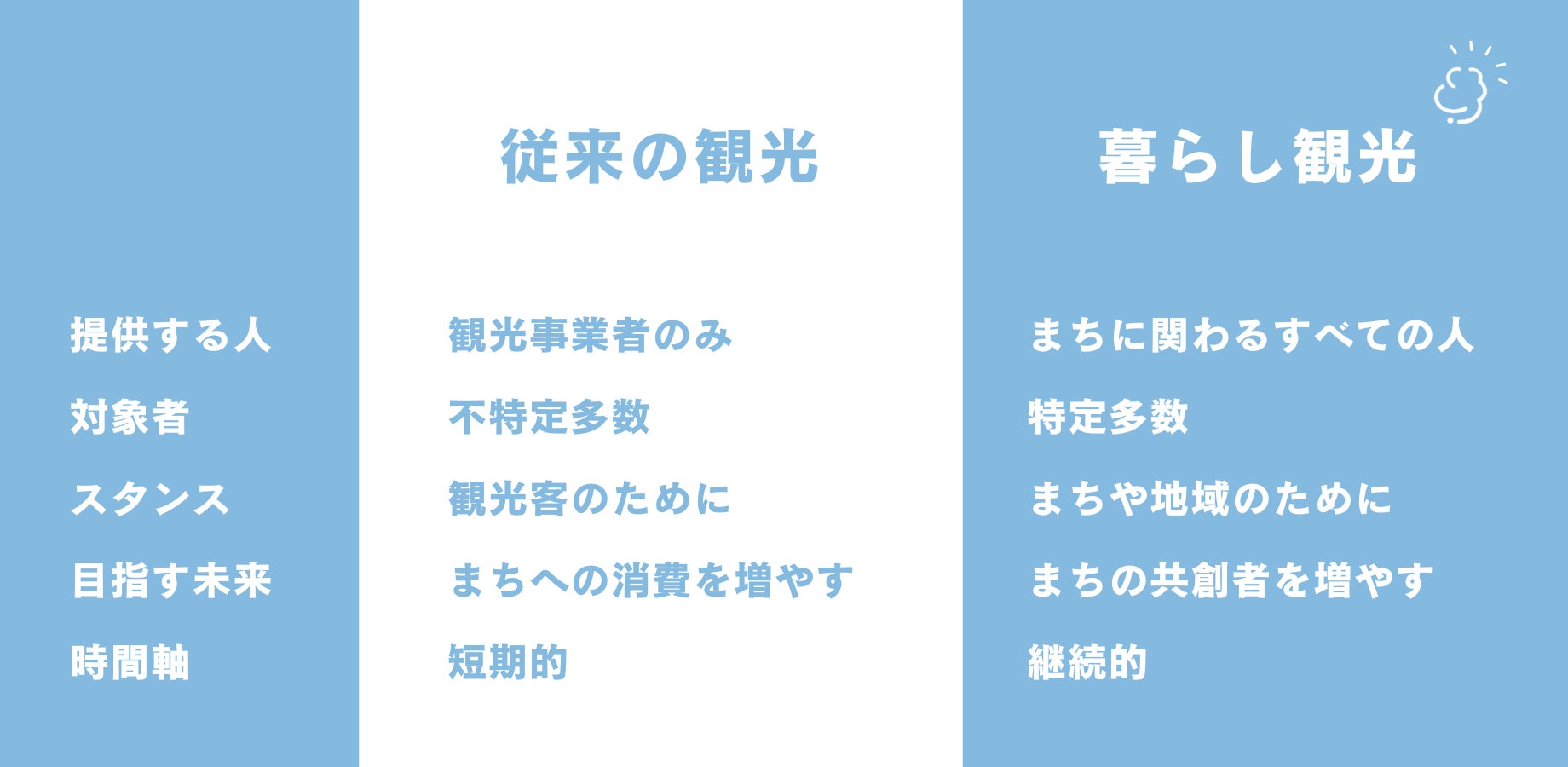 「暮らし観光と従来の観光では何が違うのか?」について整理したので、表にまとめてみました。