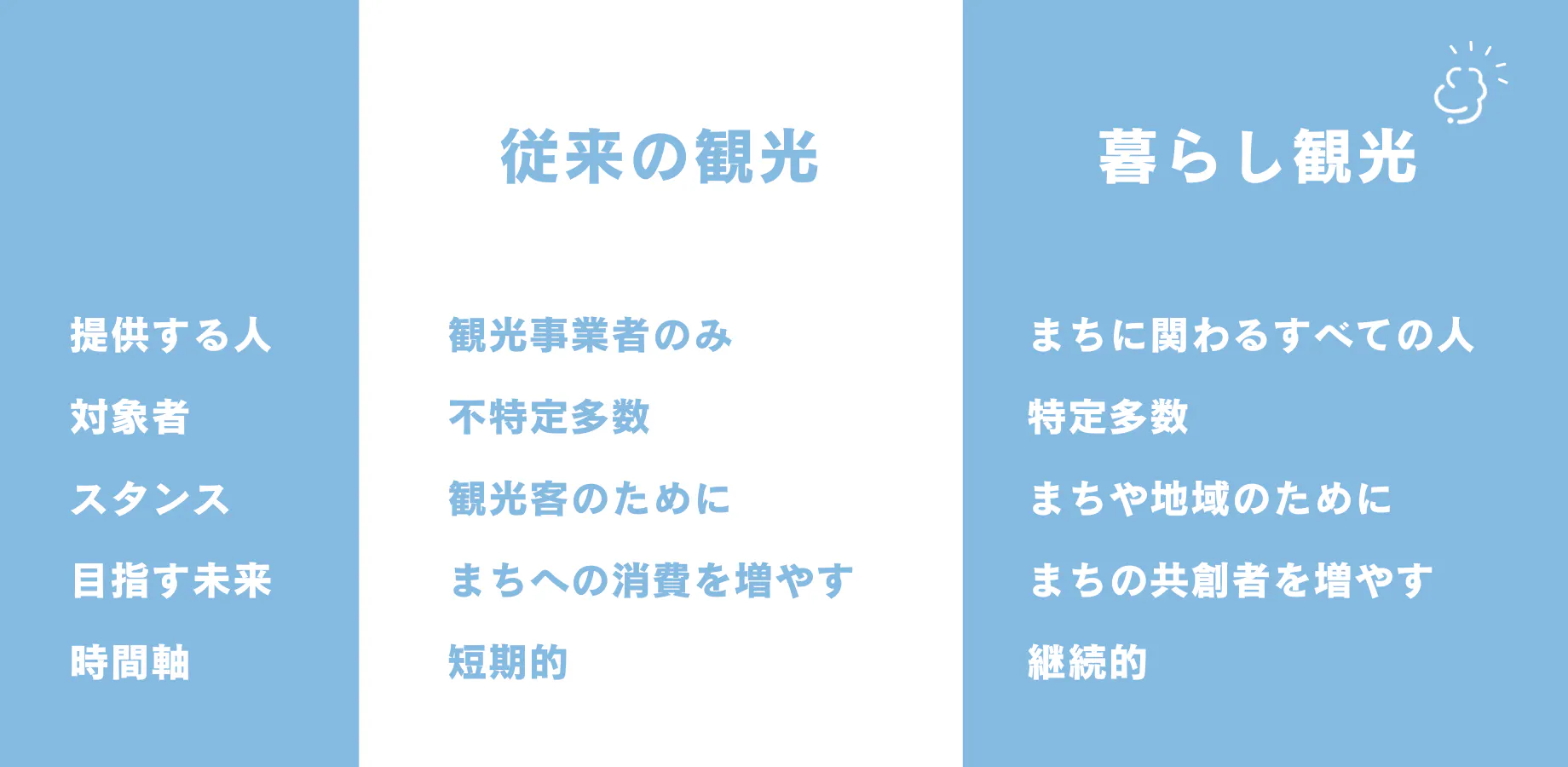 観光という言葉を使っていますが、表に記載している通りスタンスは「まちや地域のために」。つまり、まちづくりやコミュニティマネジメント的な姿勢です。