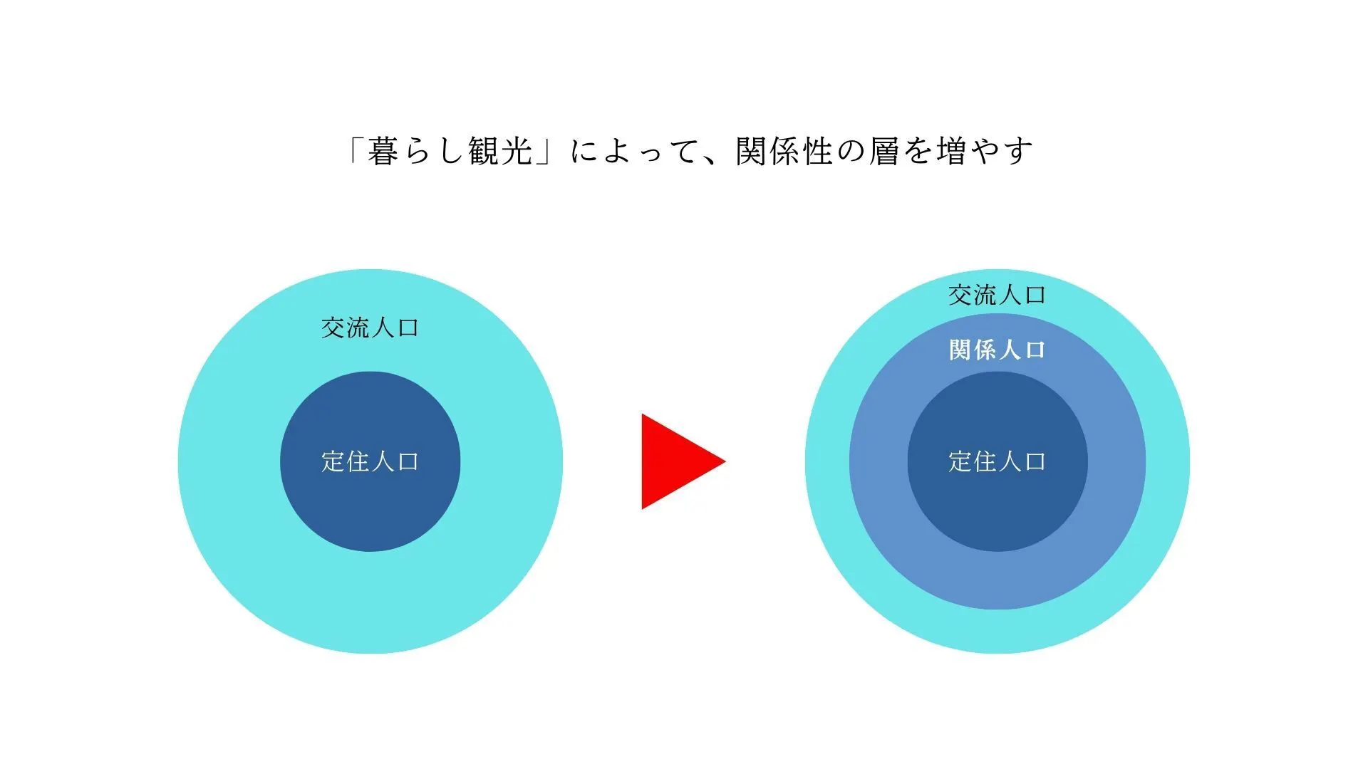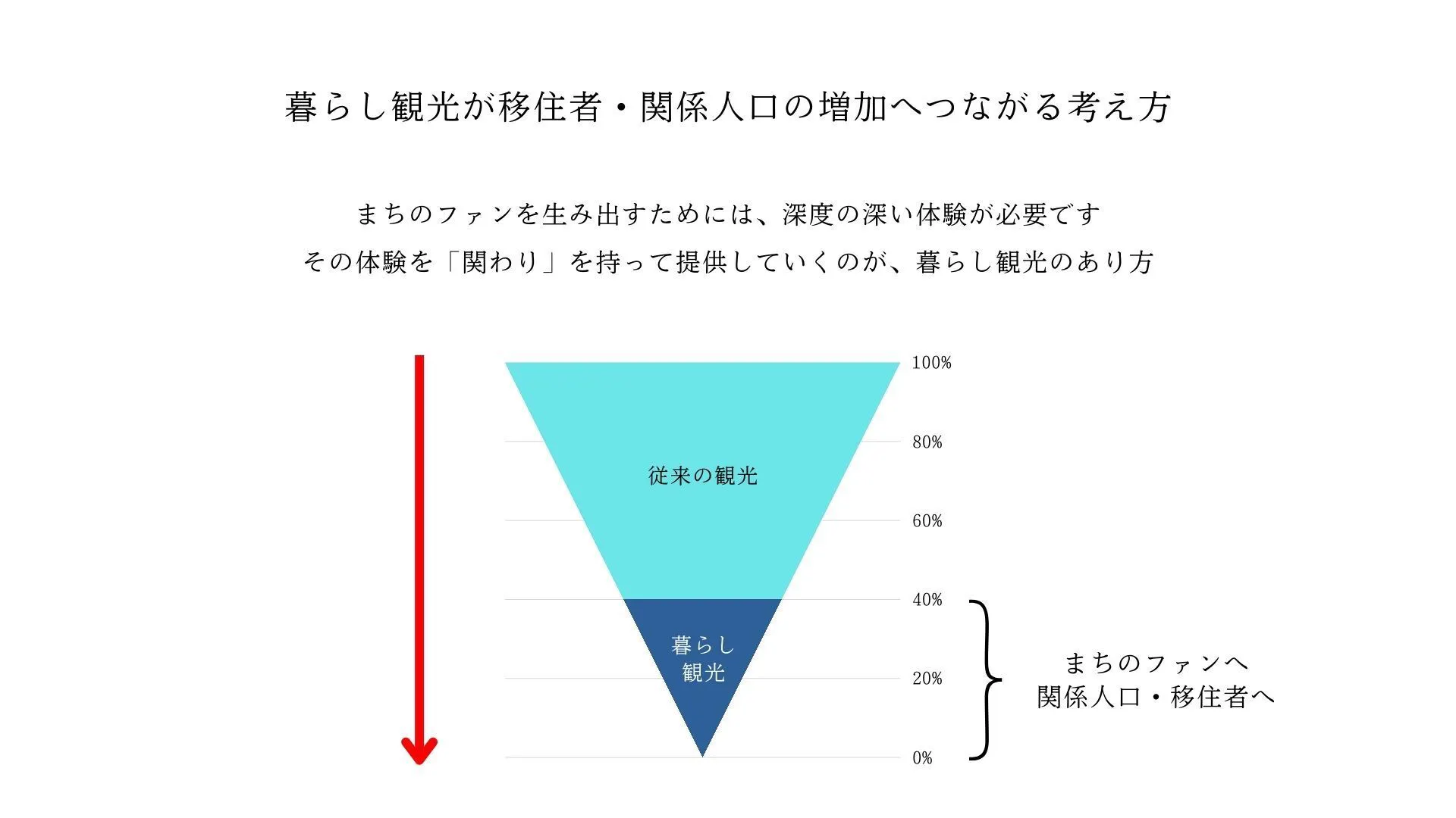 その結果、まちの豊かさにつながる人の流れが生まれていく。具体的には、まちのファン・関係人口・移住者の流れです。