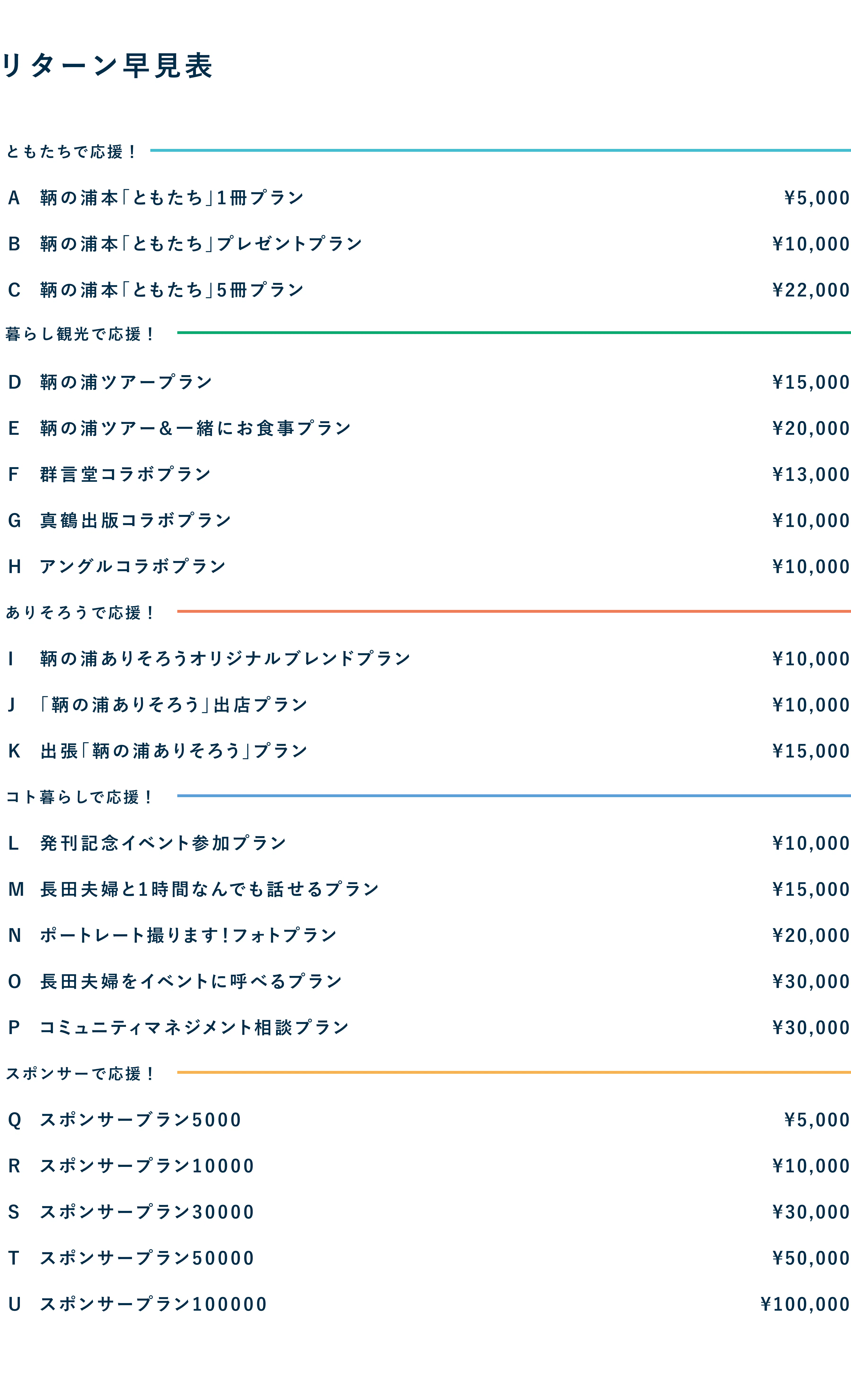 今回のリターンは、鞆の浦本「ともたち」に限らず、暮らし観光を体験できるプランや、古民家カフェ&私設図書館「鞆の浦ありそろう」やコト暮らしを活用したプランなどを準備してみました。