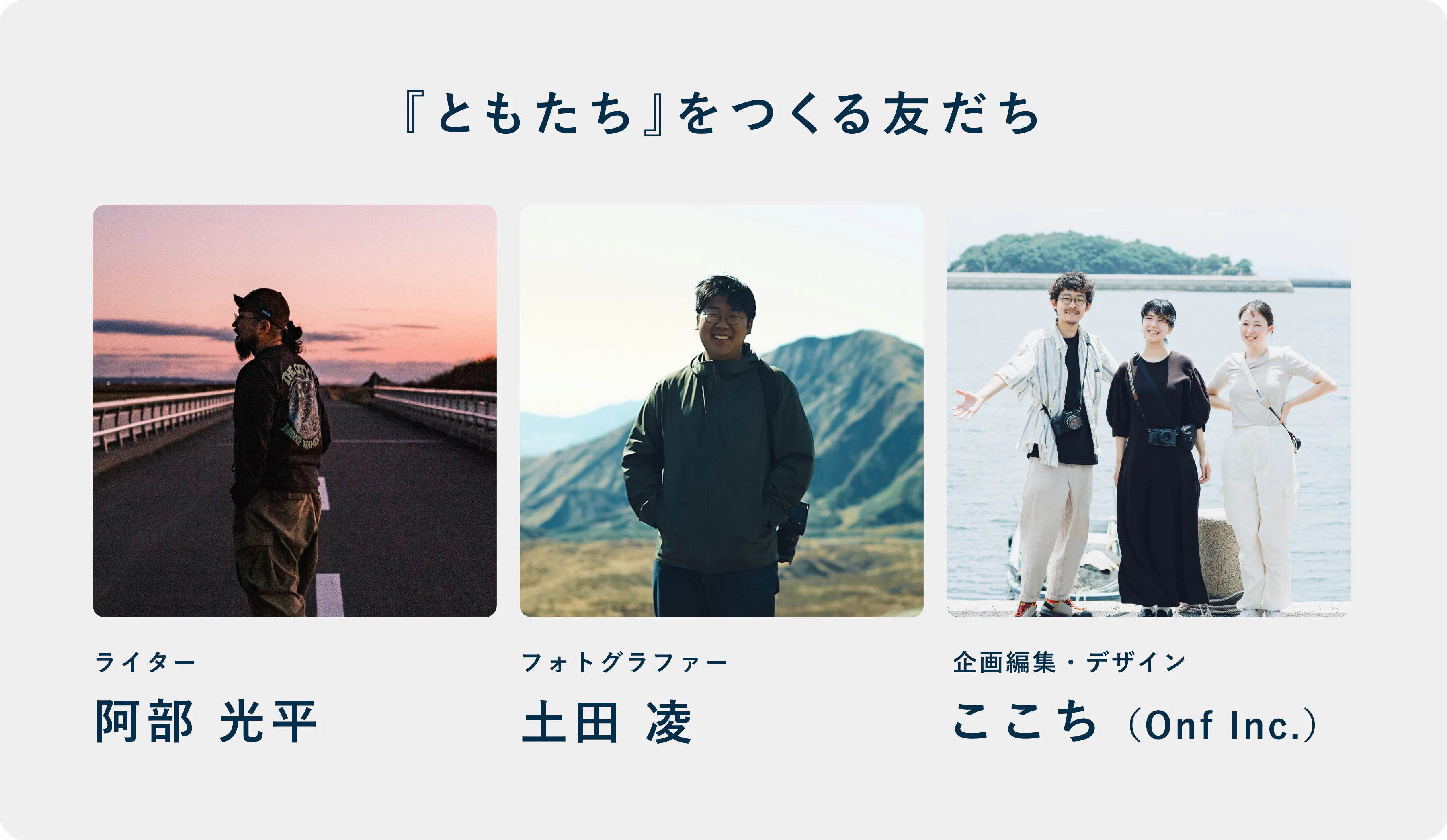 婚約や結婚式など、長田夫婦の大事なタイミングで撮影をしてくれている友人です。彼の撮る写真がとても好きで。撮ってもらうたびに、何度も何度も写真を見返して、当時の想いを振り返っています。また、阿部さんの「生活圏」の写真も土田さんが撮影しています。他にも、全国様々な場所で撮り続けていて、自身でも"地域と暮らし"をテーマとした本を制作したこともある方です。そんなローカルでの関わりを大切にしている土田さんが写す鞆の浦を、本を通じて届けられることがとても嬉しく思っています。