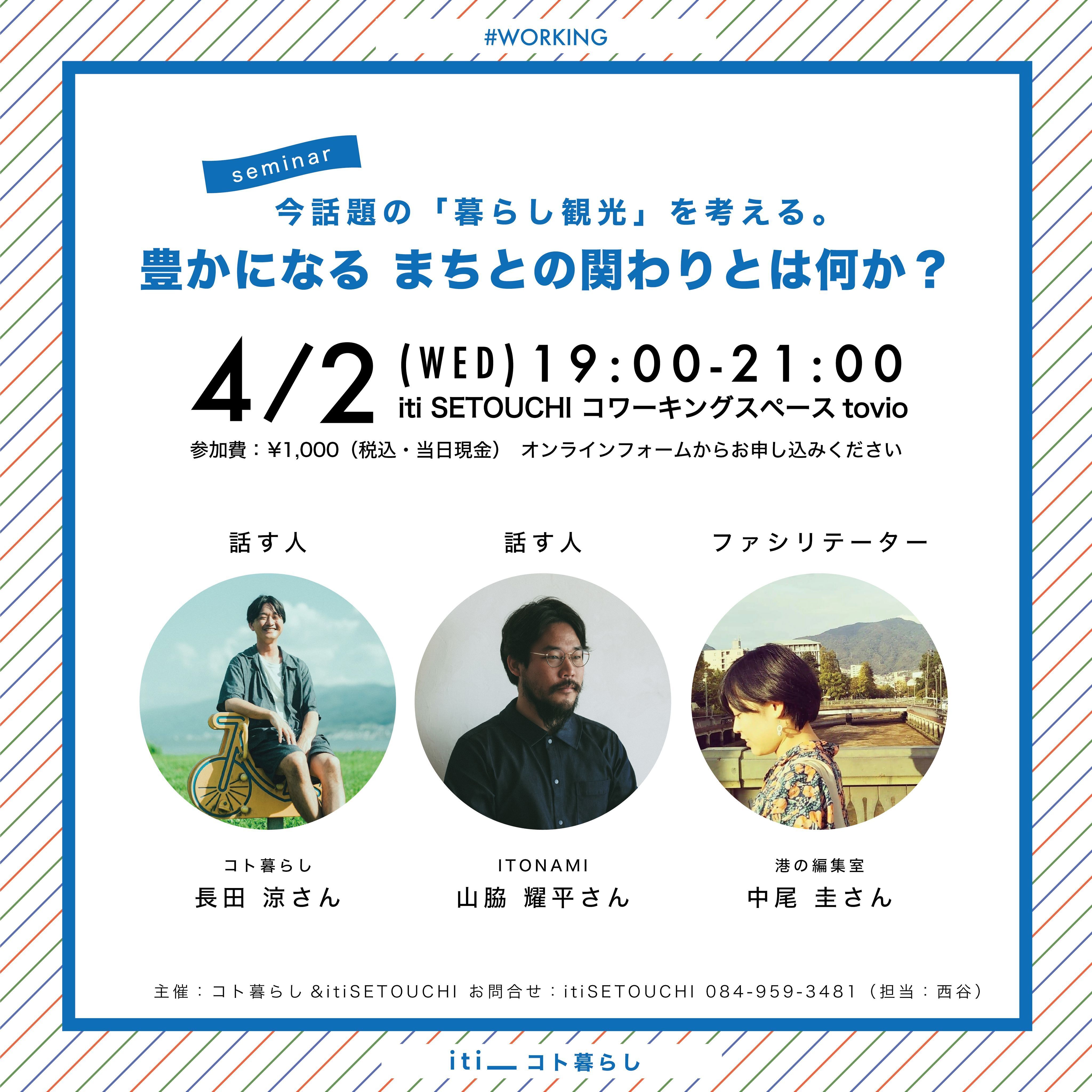 タイトルが「今話題の暮らし観光を考える。豊かになるまちとの関わりとは何か?」と、暮らし観光をど真ん中に置いたテーマとなっています。
