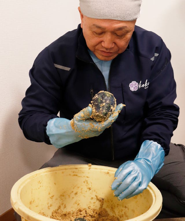 おっちゃんは「ぬかは命のようなもの」と言います。漬け込む様子を見ると、まるでわが子に接するかのように水なす一つ一つを大切に扱い、水なすの大きさやその日の天候に合わせて最適な漬かり具合になるように作業している様子はまさに職人そのものでした。