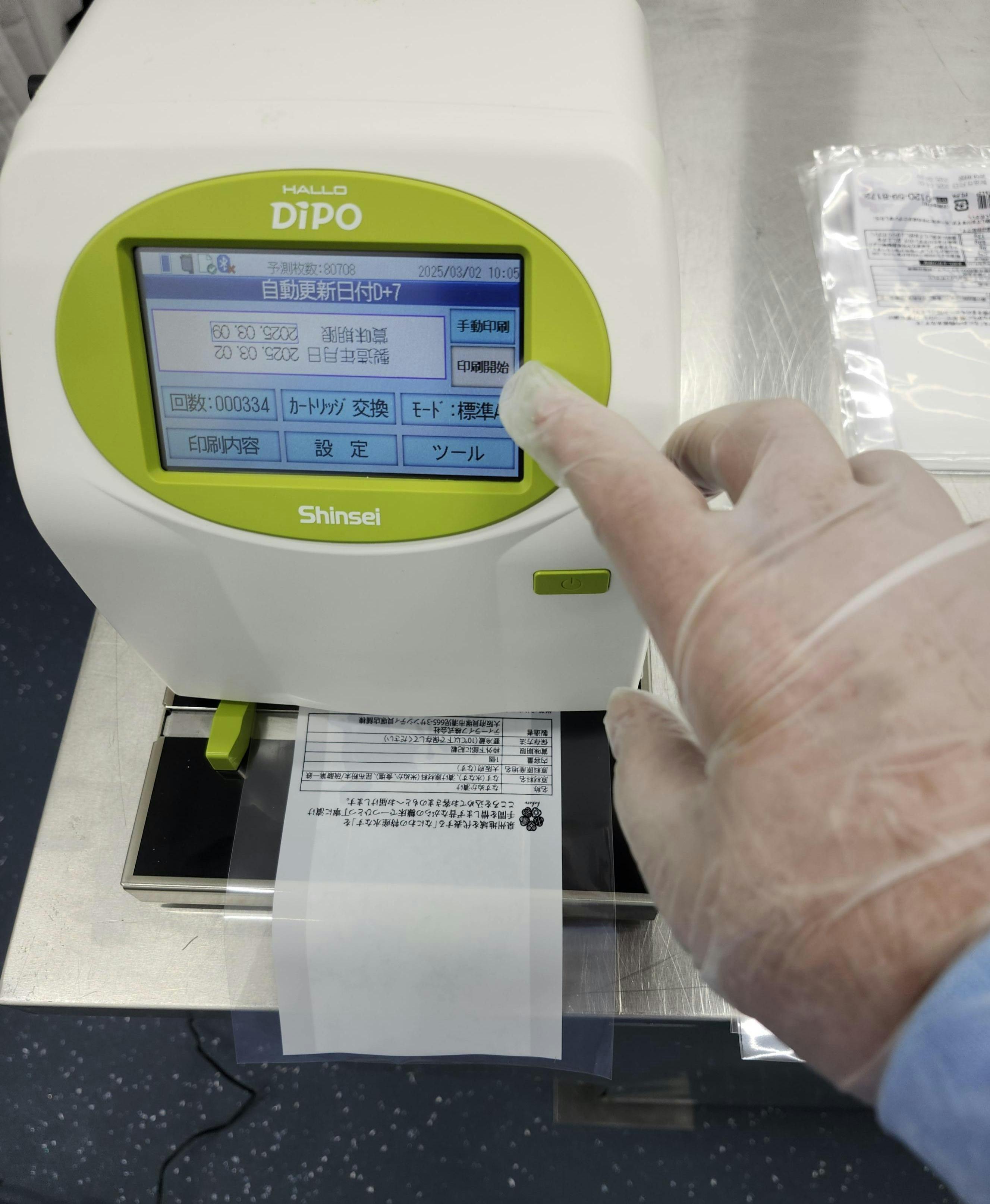 糠を漬ける前に、袋に製造年月日と賞味期限を印字します。