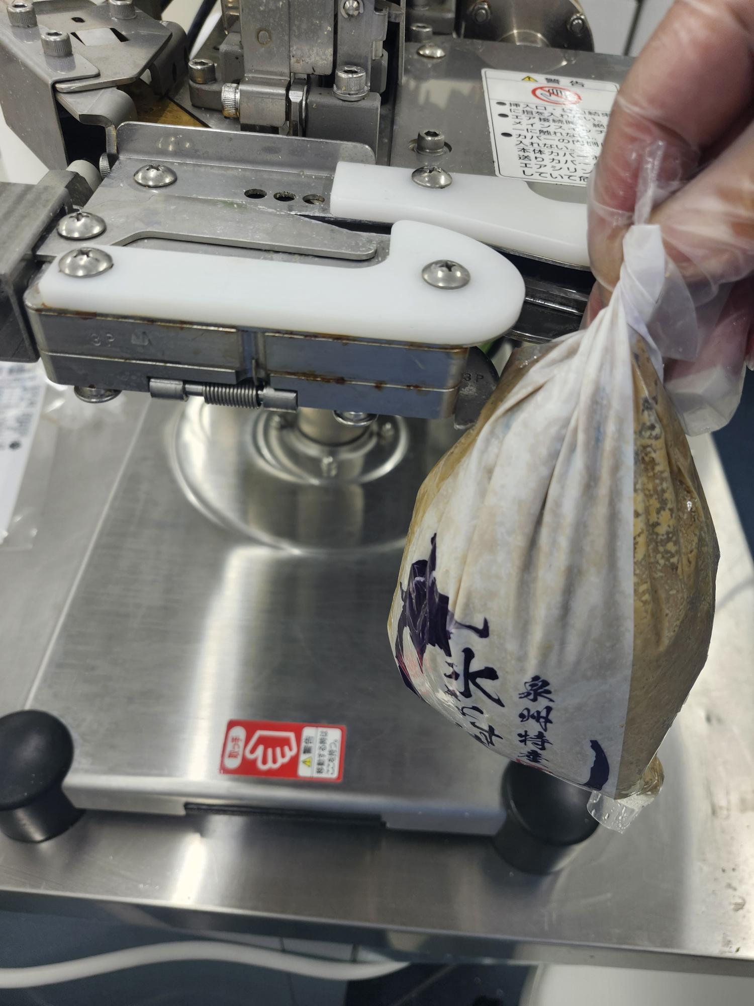 丁寧に袋詰めを行った後は、機械で口を留めます。