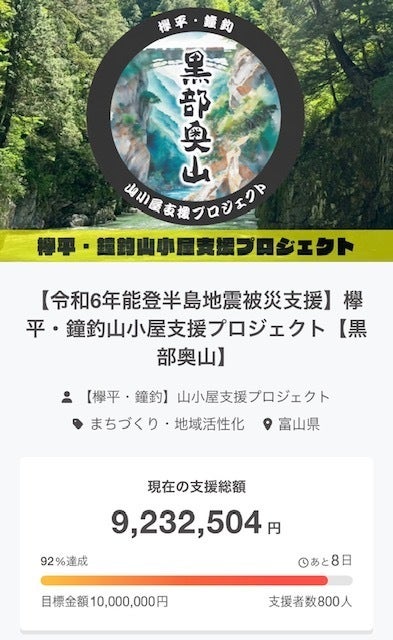 欅平・鐘釣山小屋支援プロジェクトにたくさんのご支援をいただき、ありがとうございます。支援者数は800人、支援総額は900万円を超え、更には皆様からお寄せいただいた温かく想いの込もった応援メッセージにも大変励まされています!