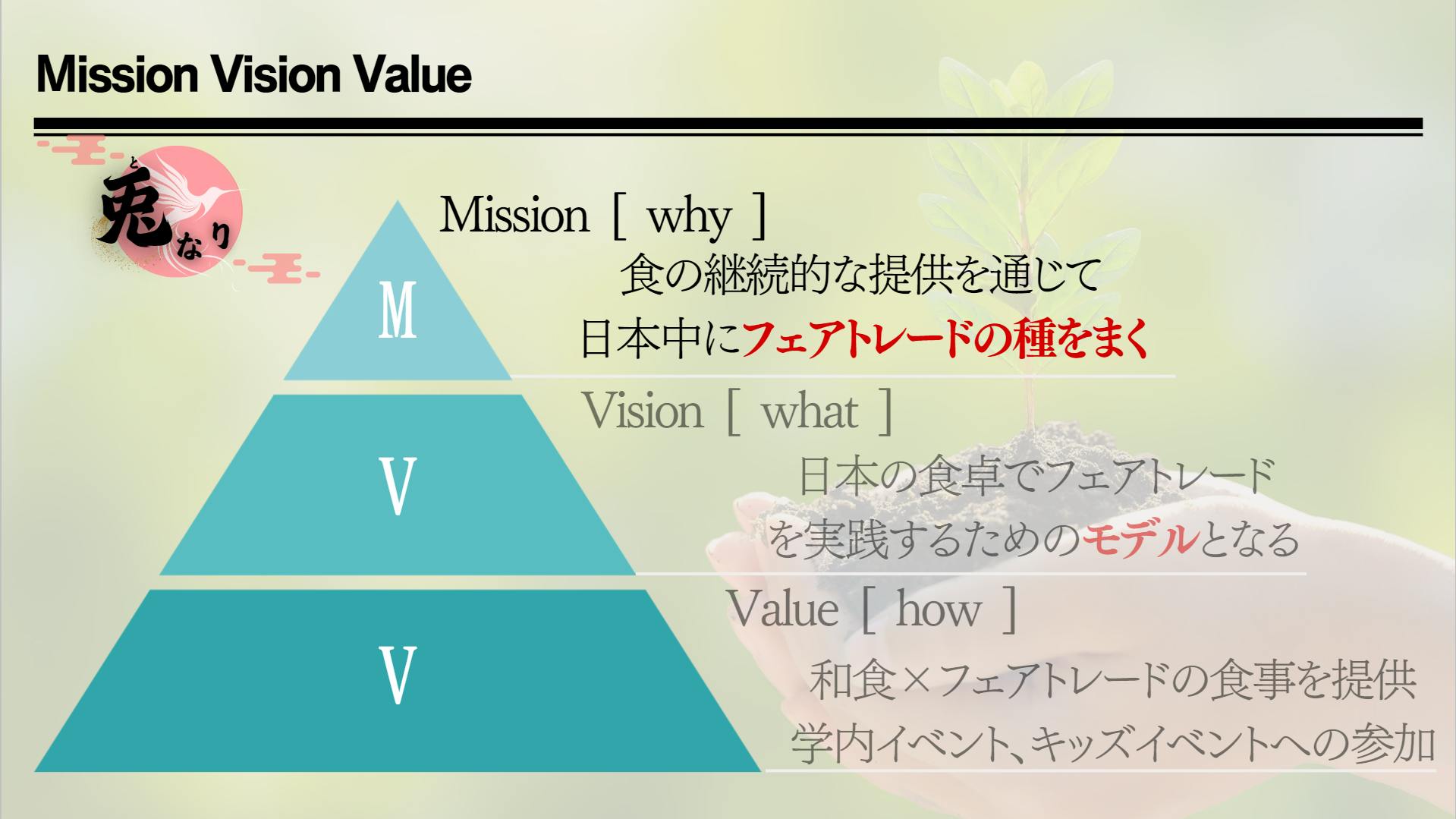 兎なりの事業では、日本人に馴染みのある「和食」と「フェアトレード」を掛け合わせたお食事の提供を中心とした事業で、その価値をより多くの人に届けていきたい思っています!
