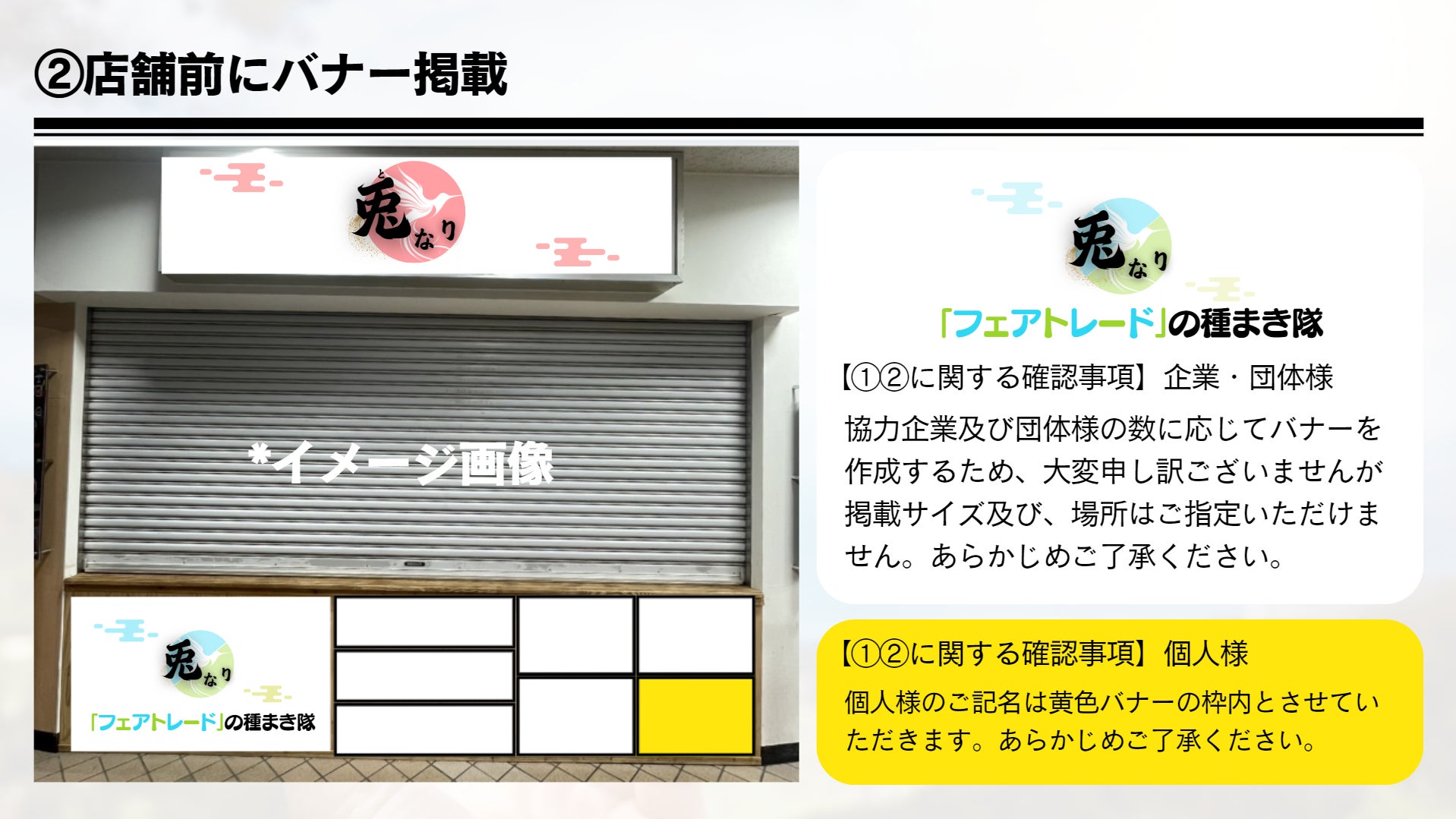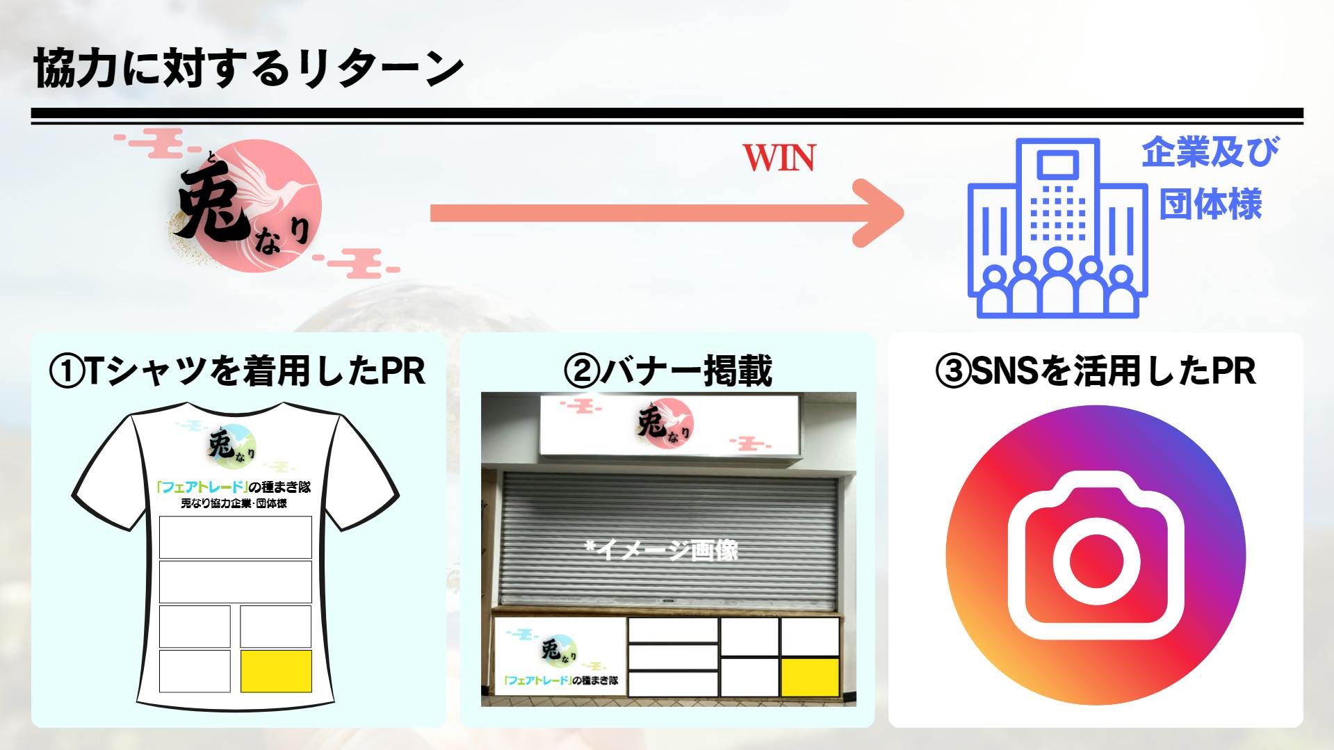 → ①店舗前バナーへの記名 ②メディア出演用「Tシャツ」への記名 *③兎なりInstagramからの企業・団体概要、商品等のPR発信(*③に関しては個人様は対象外となります。)