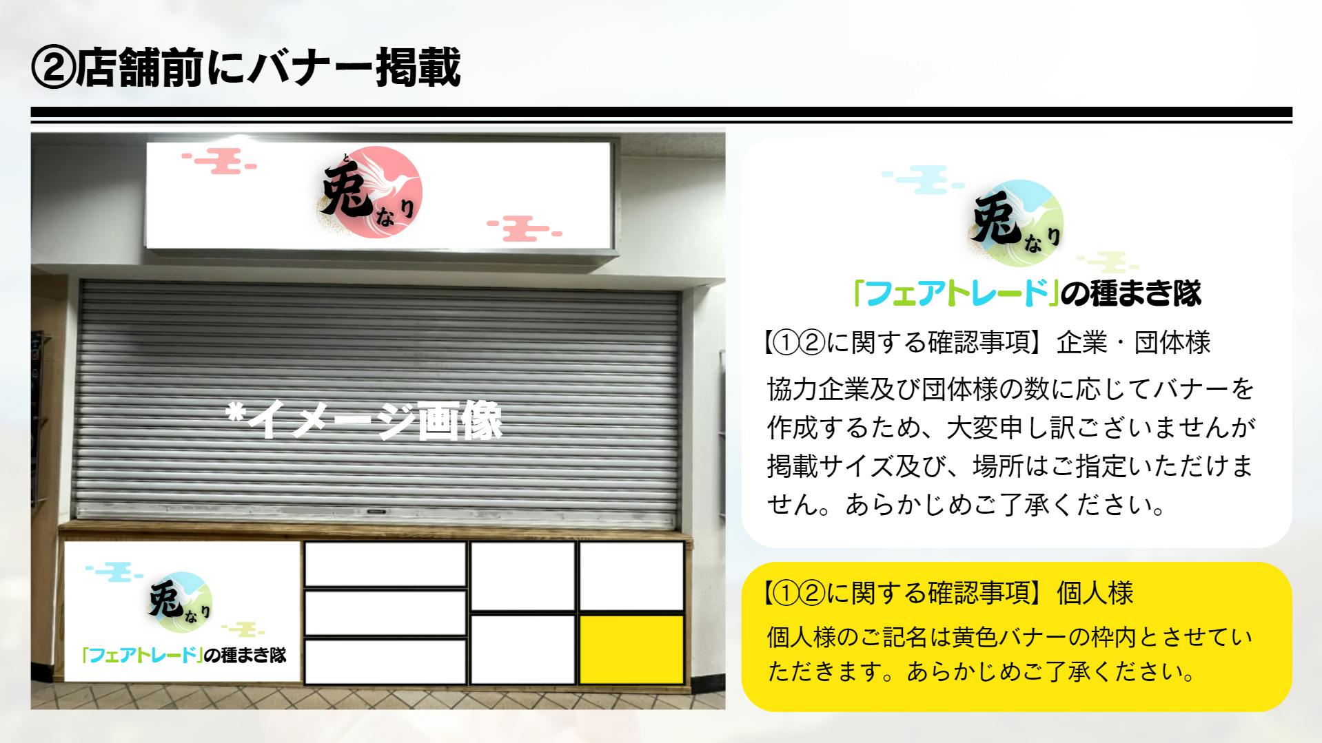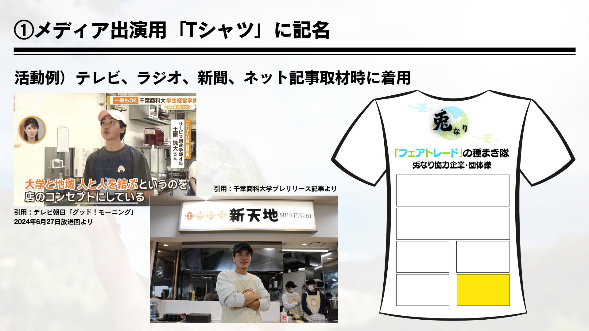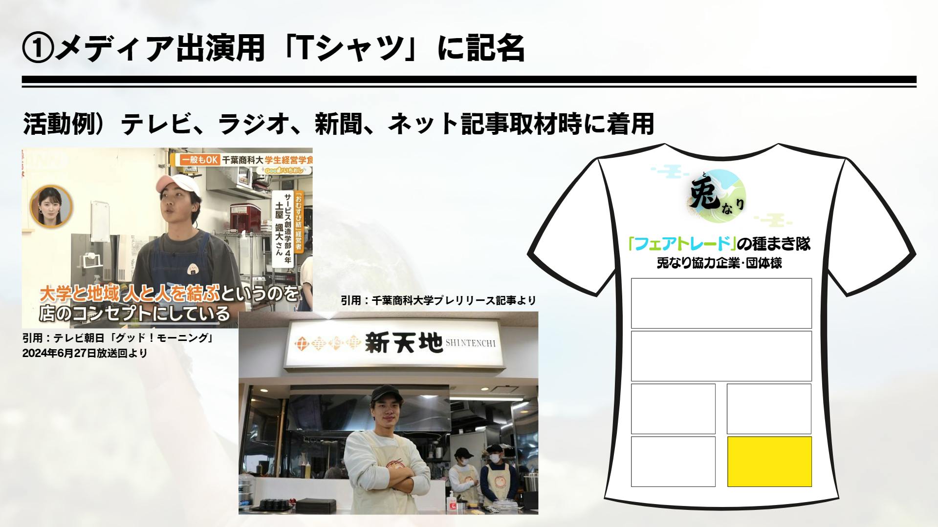 → ①店舗前バナーへの記名 ②メディア出演用「Tシャツ」への記名