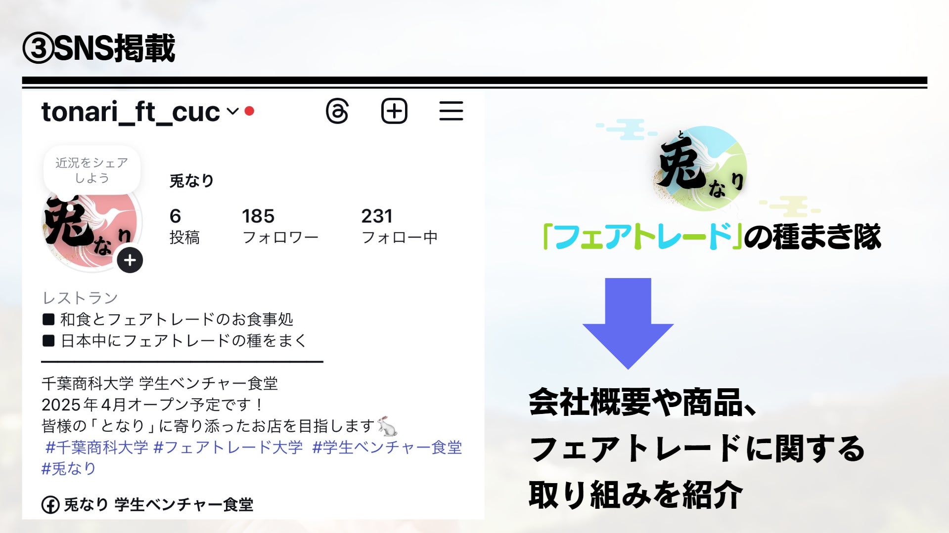 今年4月に個人事業主として千葉商科大学内に「兎なり」をオープンし、「日本中にフェアトレードの種をまく」飲食提供を中心とした事業をスタートします!