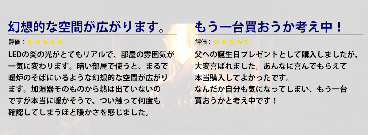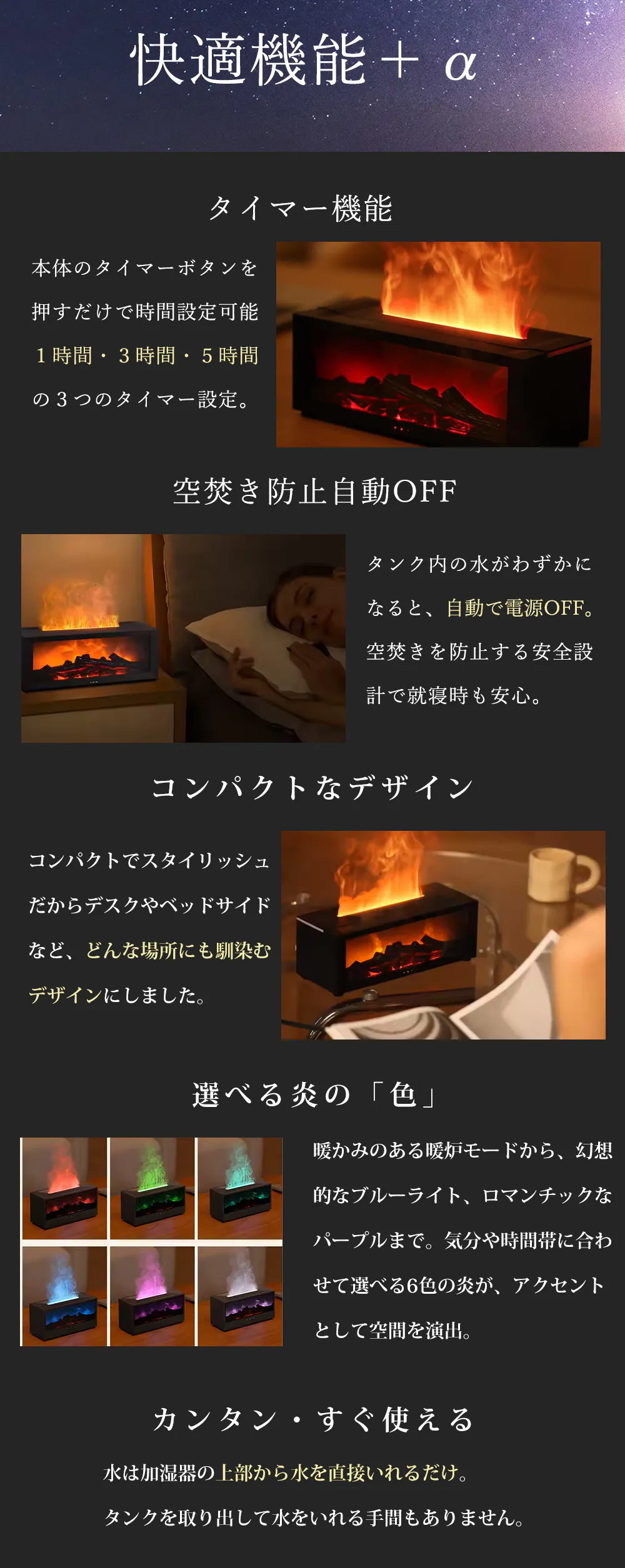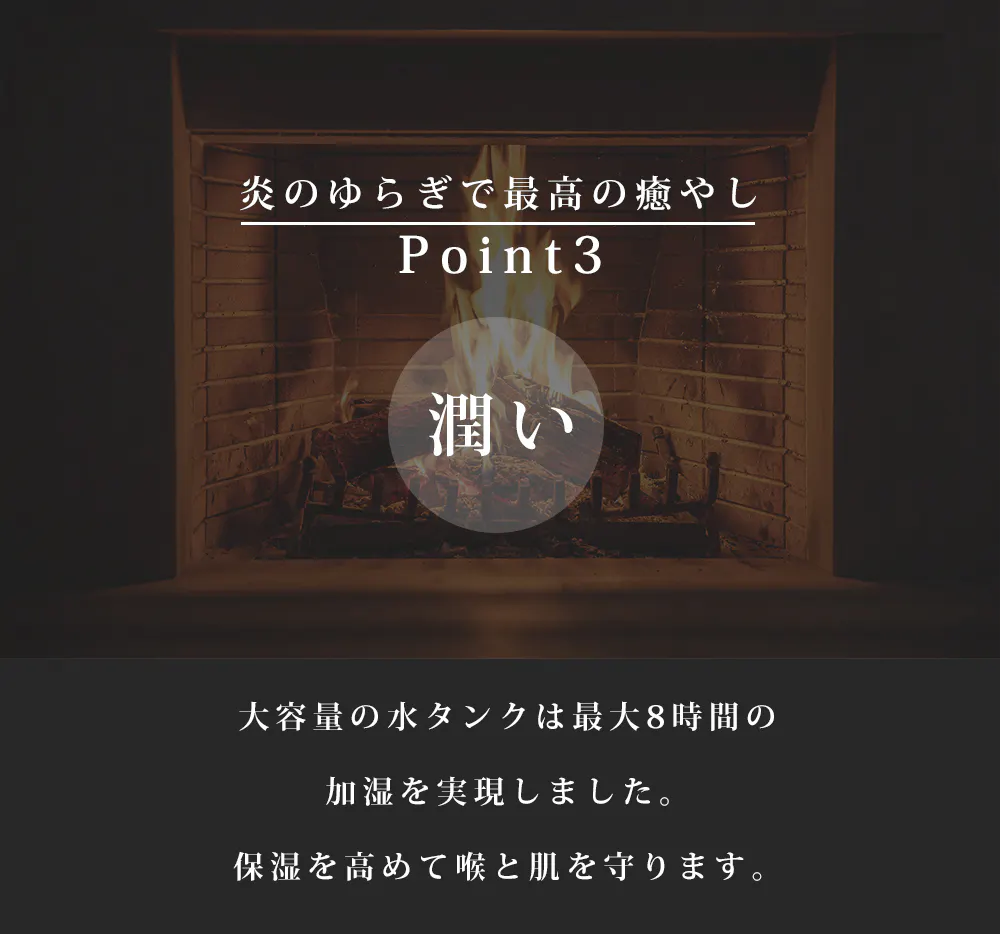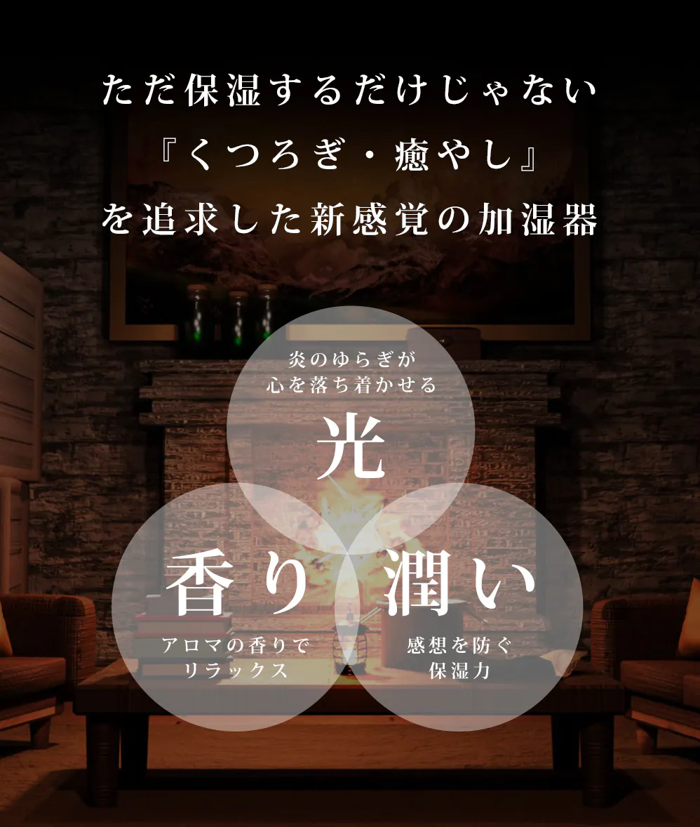 幻想的な炎の演出と、潤いあるミストで、五感を満たします。