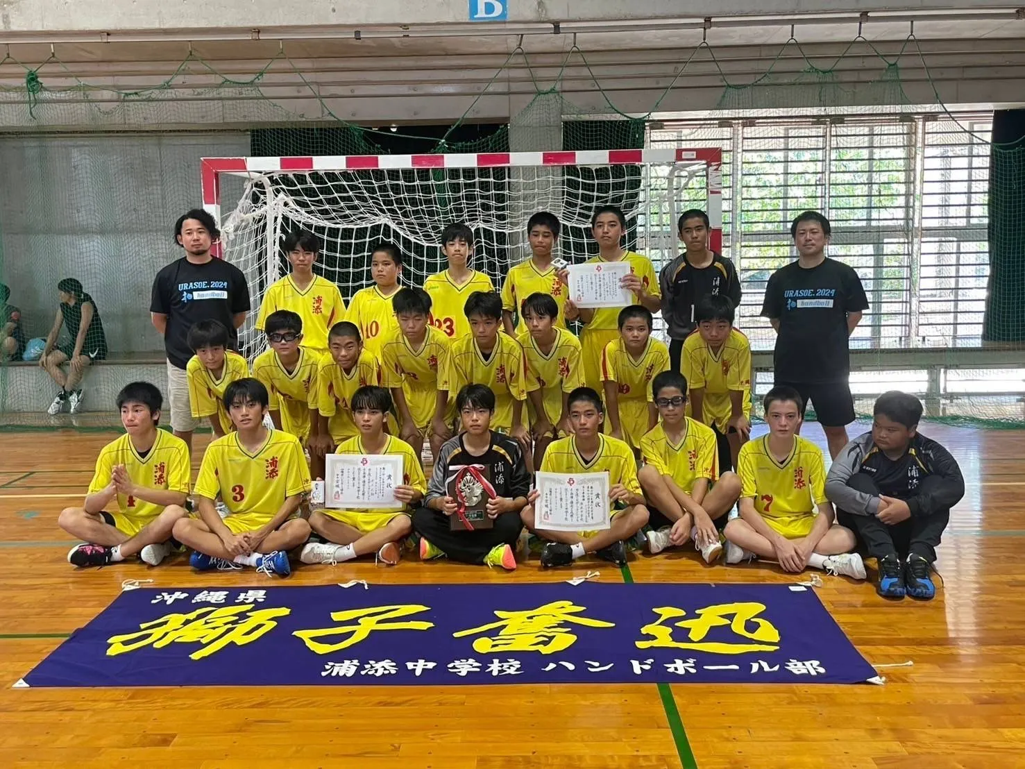 私たち浦添中学校ハンドボール部は、チームの合言葉である【思いやり】を持って学校生活、部活動に励んでいます。