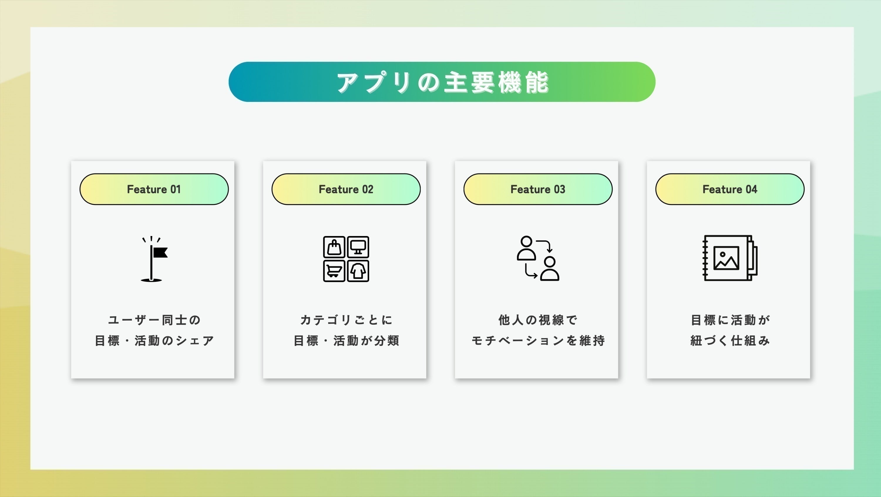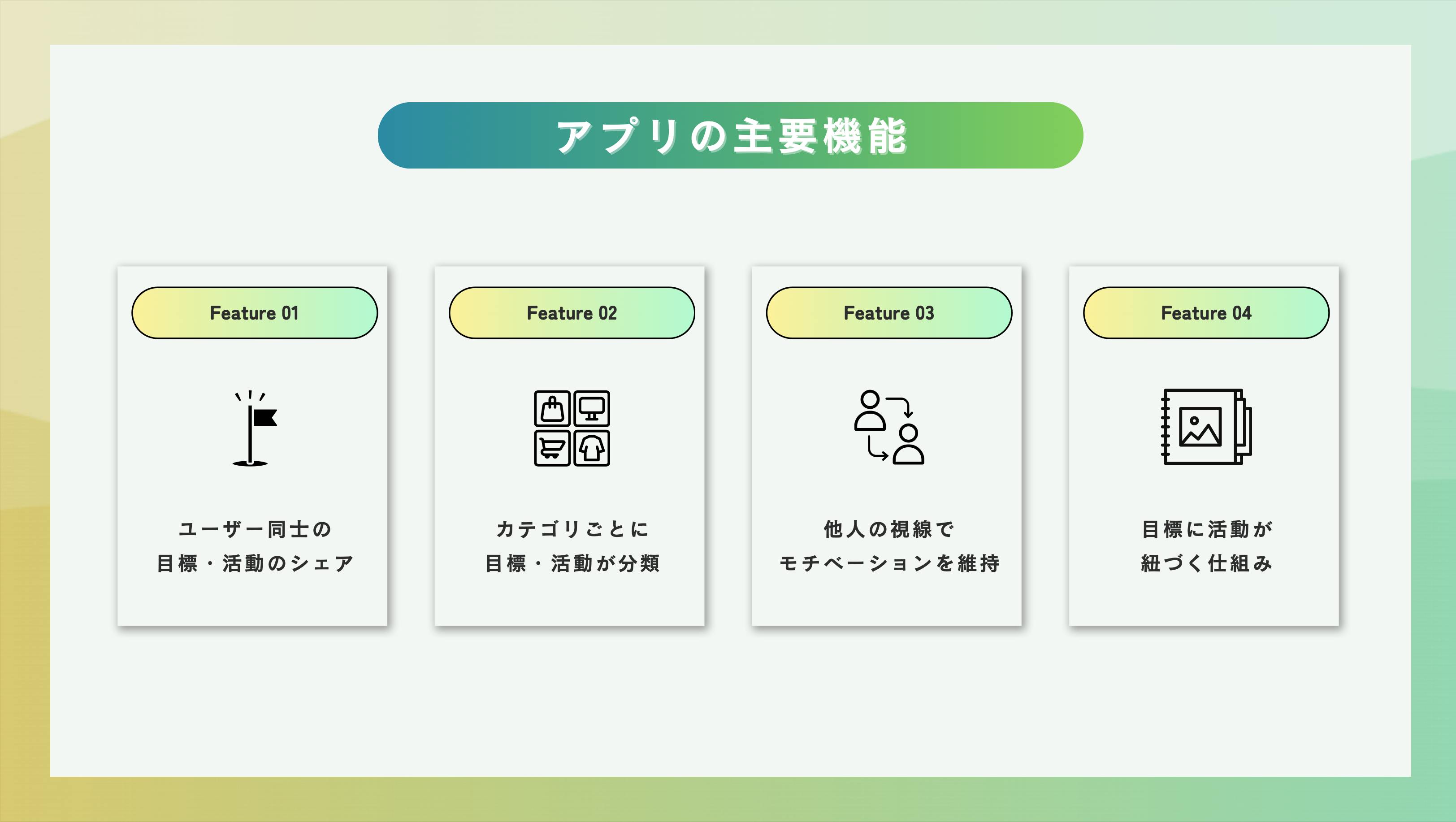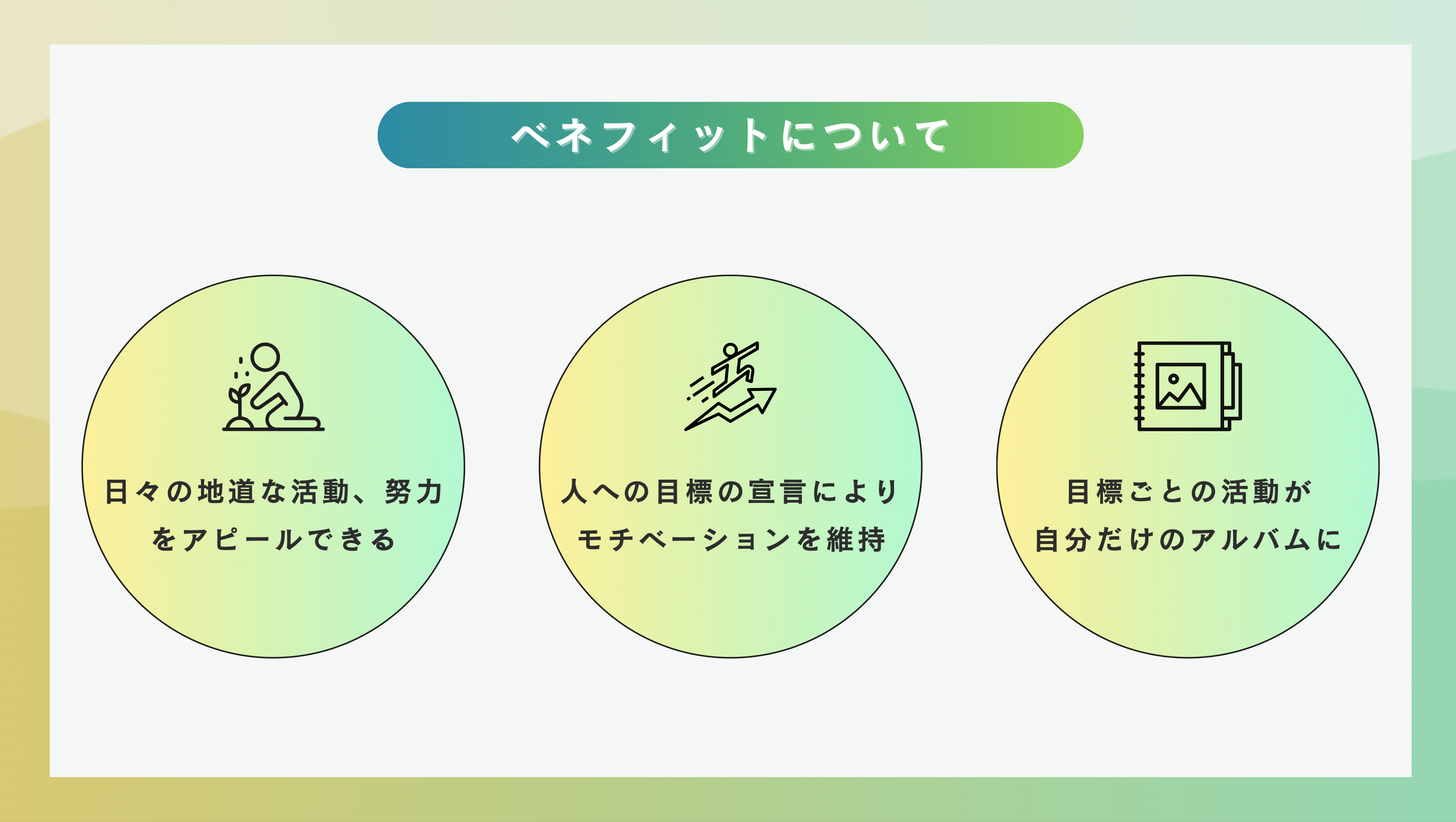 自分の設定した目標が、他人から見える状態になるため、目標に対するモチベーションを維持することができます。