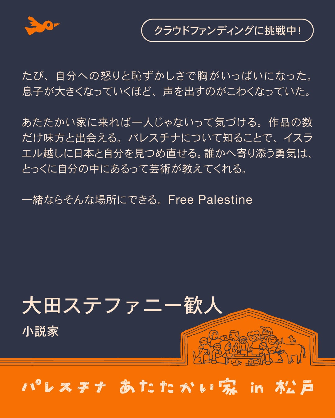 あたたかい家に来れば一人じゃないって気づける。作品の数だけ味方と出会える。パレスチナについて知ることで、イスラエル越しに日本と自分を見つめ直せる。誰かへ寄り添う勇気は、とっくに自分の中にあるって芸術が教えてくれる。