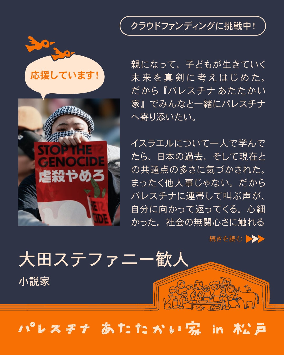 親になって、子どもが生きていく未来を真剣に考えはじめた。だから『パレスチナ あたたかい家』でみんなと一緒にパレスチナへ寄り添いたい。