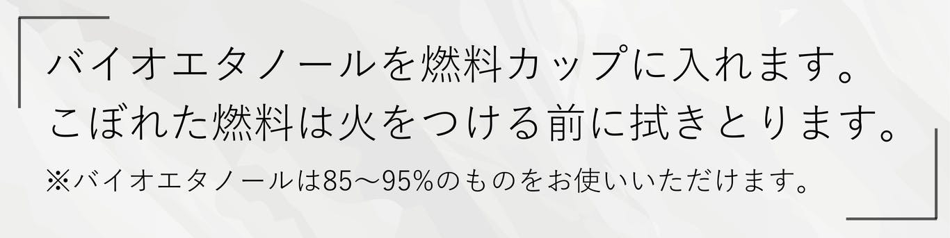 A. 使用する燃料はバイオエタノール(85〜95%)です。市販のバイオエタノールをご使用いただけますが、それ以外の燃料は使用しないでください。