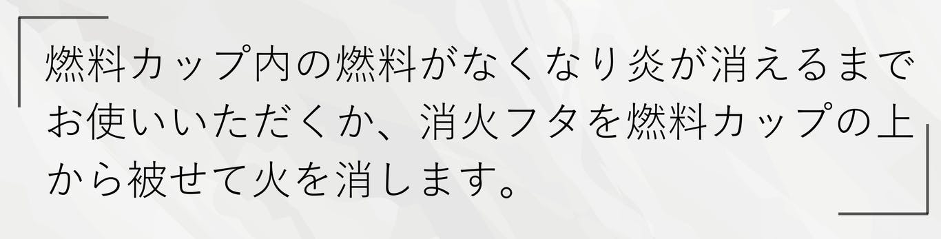 A. 使用する燃料や環境によって異なりますが、燃料カップに約150ml(上から2cmほど)を注ぐと、約45分持続します。付属のリングを使用すると、同じ量の燃料で約80分の持続時間になります。