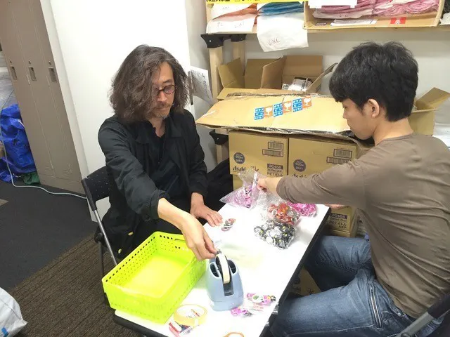 参考画像:豊岡大会で缶バッジを袋詰めする劇作家の鐘下辰男