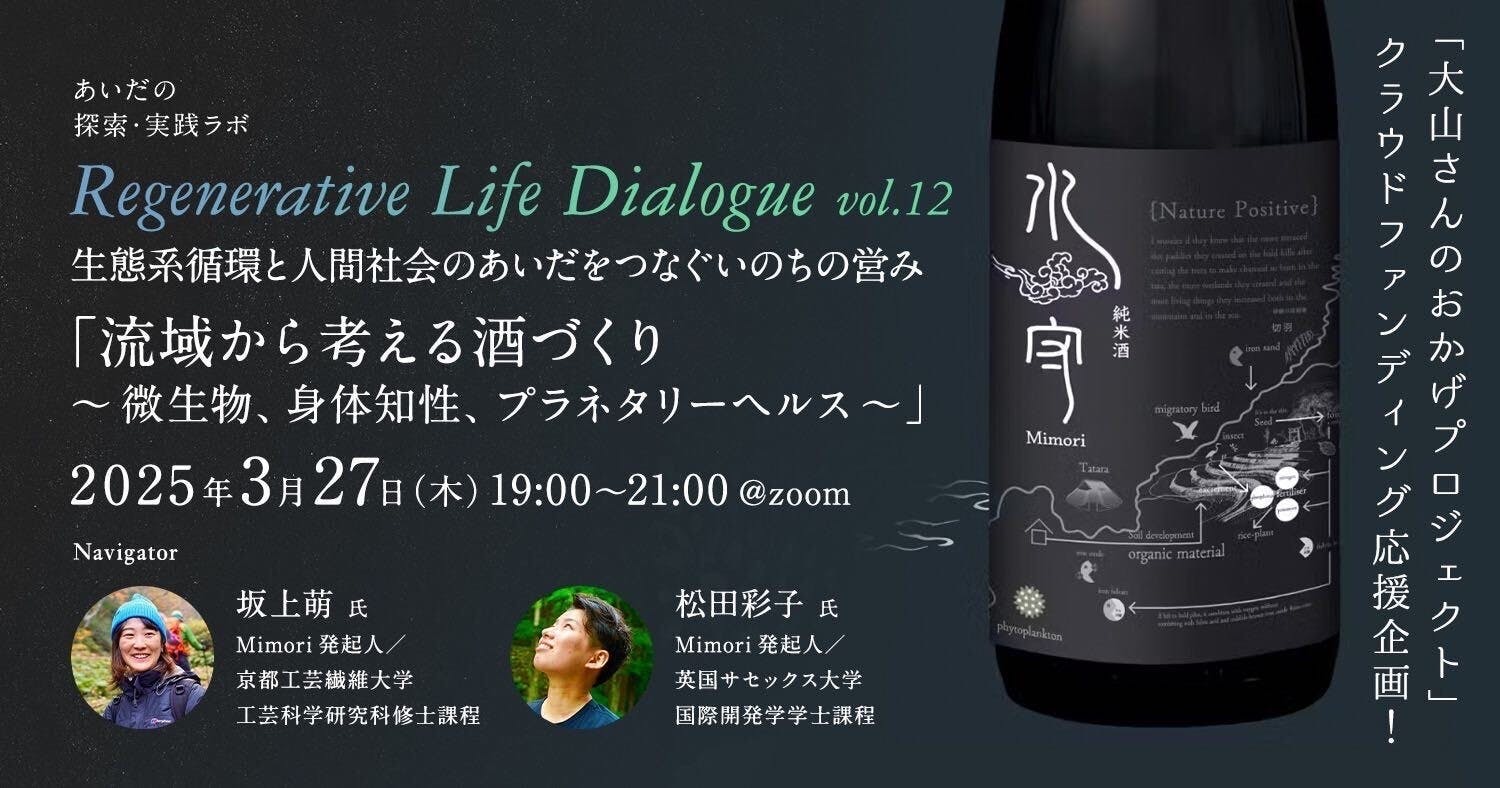 二日前に開催されましたクラウドファンディング応援企画「流域から考える酒づくり〜微生物、身体知性、プラネタリーヘルス〜(坂上萌、松田彩子 feat. 桐村里紗、岡野春樹、小森優美、小林泰紘 )」に50名近くの方にご参加いただきました。流域でつながる各地の方にご参加いただきました!ありがとうございました!「なぜ流域なのか?」という問いのもとかけつけて下さった流域の先輩方と共にお話しさせていただきました。各地の瑞々しい水の様子と人の暮らしが伺える時間となりました。心に残っているのは、源流に住まうといっても、見える角度や住む場所によって、お山と人の繋がりは違いを持ち、川の性格によって暮らし方や関わり方は多様であるということ。私たちの身体はいただく食べ物や水で毎日変わっていくように、常に、私も流域も移ろい、変わり続けている。生きることは、そんな変化に気づく小さな旅を日常に見出すことなんだなと、大山さんの麓で暮らし始めて思うようになりました。お酒は、土地のお水とお米、菌とで生まれ、毎年違うもの。「水守」お酒は、大山さんと繋がり、微細な変化に気づことが楽しいと思ってもらえる一つになればいいなと思っています。なんといっても、昨夜のセッションの空間は、お会いしたこともない方まで繋がっているような不思議な場でした。Mimoriの活動では、ぜひ各地の源流とそのゲートキーパーの方々と繋がっていきたいと思っています。この場をセッティングして下さった 小林 泰紘さん!かけてつけて下さった 桐村 里紗 さん、 岡野 春樹 さん、 小森 優美さん、 Feilang Tseng さん、 大原 徹さん。本当にありがとうございました!!