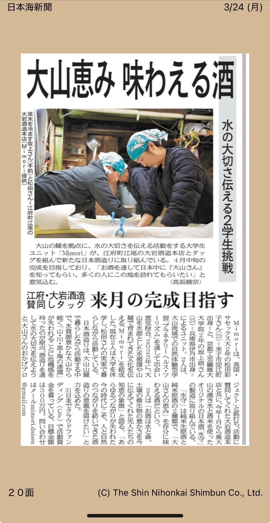 日本海新聞に「大山さんのおかげプロジェクト」掲載していただきました!この1年間、大山さんでいただいたものを次の人に渡す第一歩であるお酒造り。沢山の方々に届きますように!!!引き続きよろしくお願いいたします!