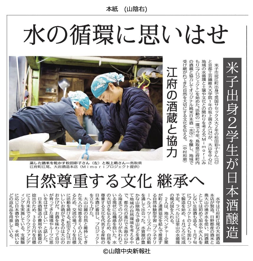 この度、山陰中央新報さんに、「水守」お酒のクラウドファンディングを取材してもらい記事となりました!