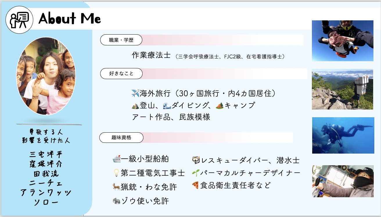 20代の半分は作業療法士、後の半分は旅やゲストハウス、留学、ワーホリetc...リハビリの仕事と関係ない「好きなこと」「やってみたいこと」に費やしながら、いろんなところから影響を受けながら生活していました。