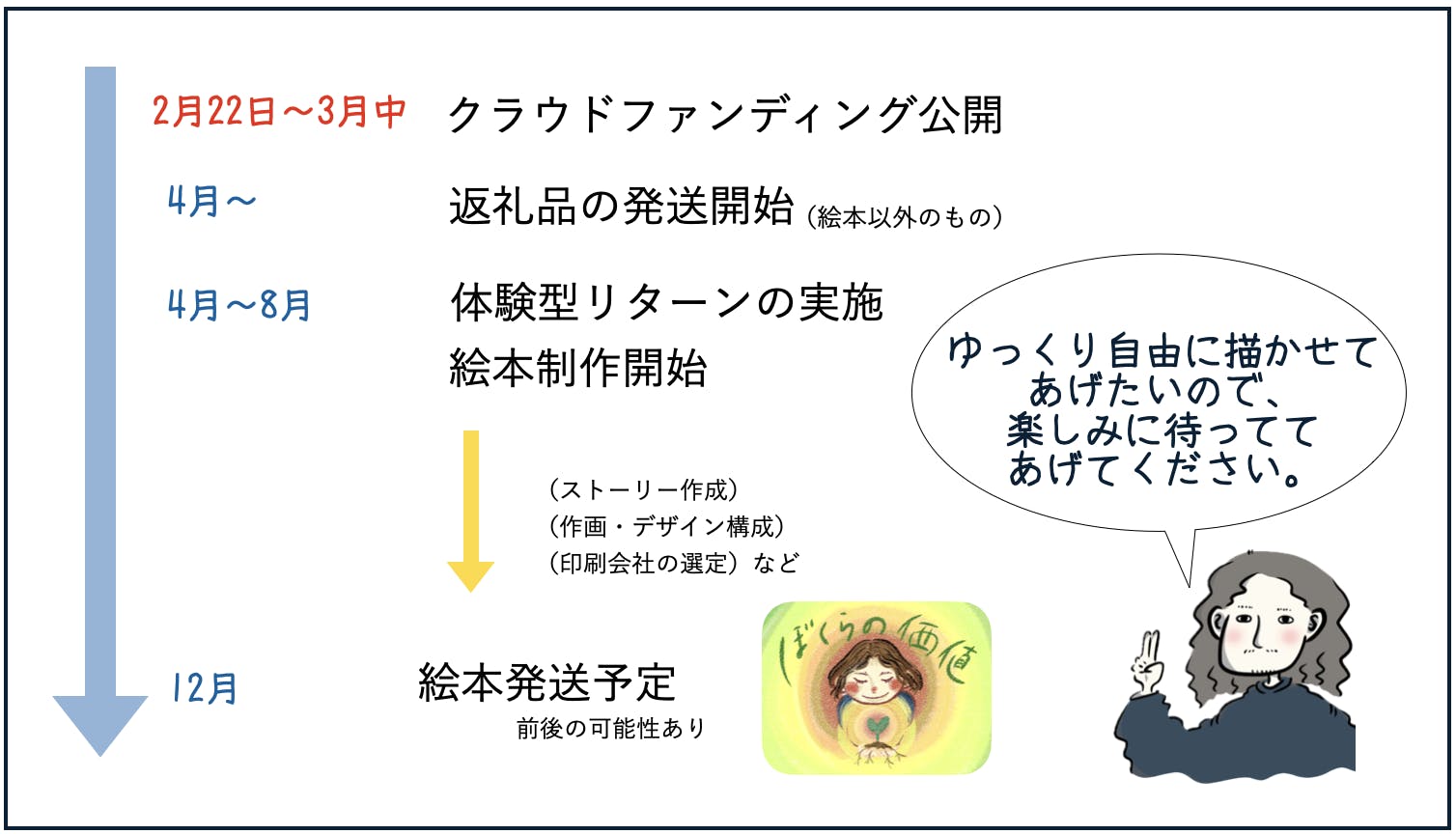 絵本のリターンは、ゆっくりと、しっかりと考えて作りたいので、2025年年内にお届けすることを目標にします。絵本以外の、書籍や商品については、クラファン終了後に随時発送してます。