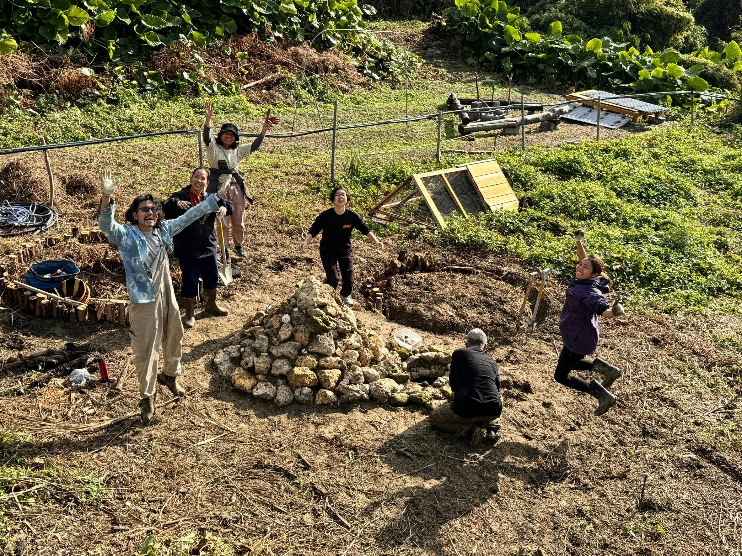 畑や施設をぐるっと視察させてもらいました。畑では、セルフビルドで立てた小屋、農に使う道具、タネをまいたポット、雨水を循環させてつくったトイレ、田んぼにいるおたまじゃくしなどなど。パーマカルチャーセンタージャパンの施設の方も案内いただき、手作りで増築した箇所を含め、ぐるっと探索させてもらいました。