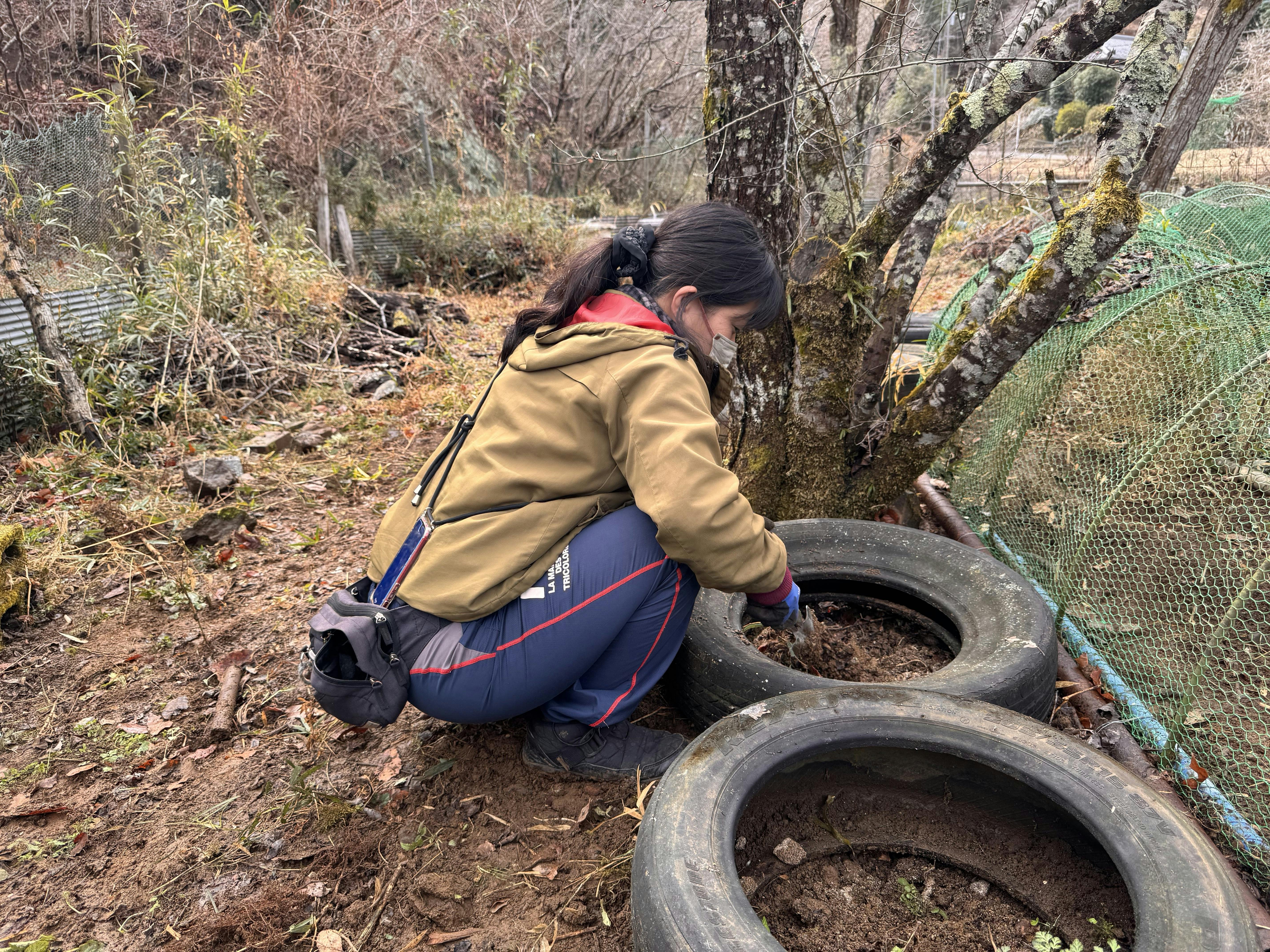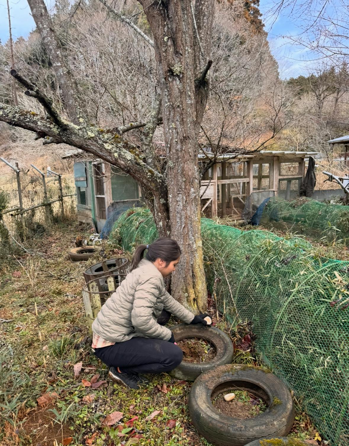 時期ということで、ジャガイモのタネイモを植えました。場所はポテトタワー!(写真のものは廃タイヤ1つですが、何個か上に重ねて使うことも多く、それがタワーっぽいから、そんな名前なのだそうです)廃タイヤを使うと、霜がおりにくいそう。ジャガイモが腐らずに済みます。肥料には暮らしで出た油かすを使用した、ぼかし肥を使っているそう。