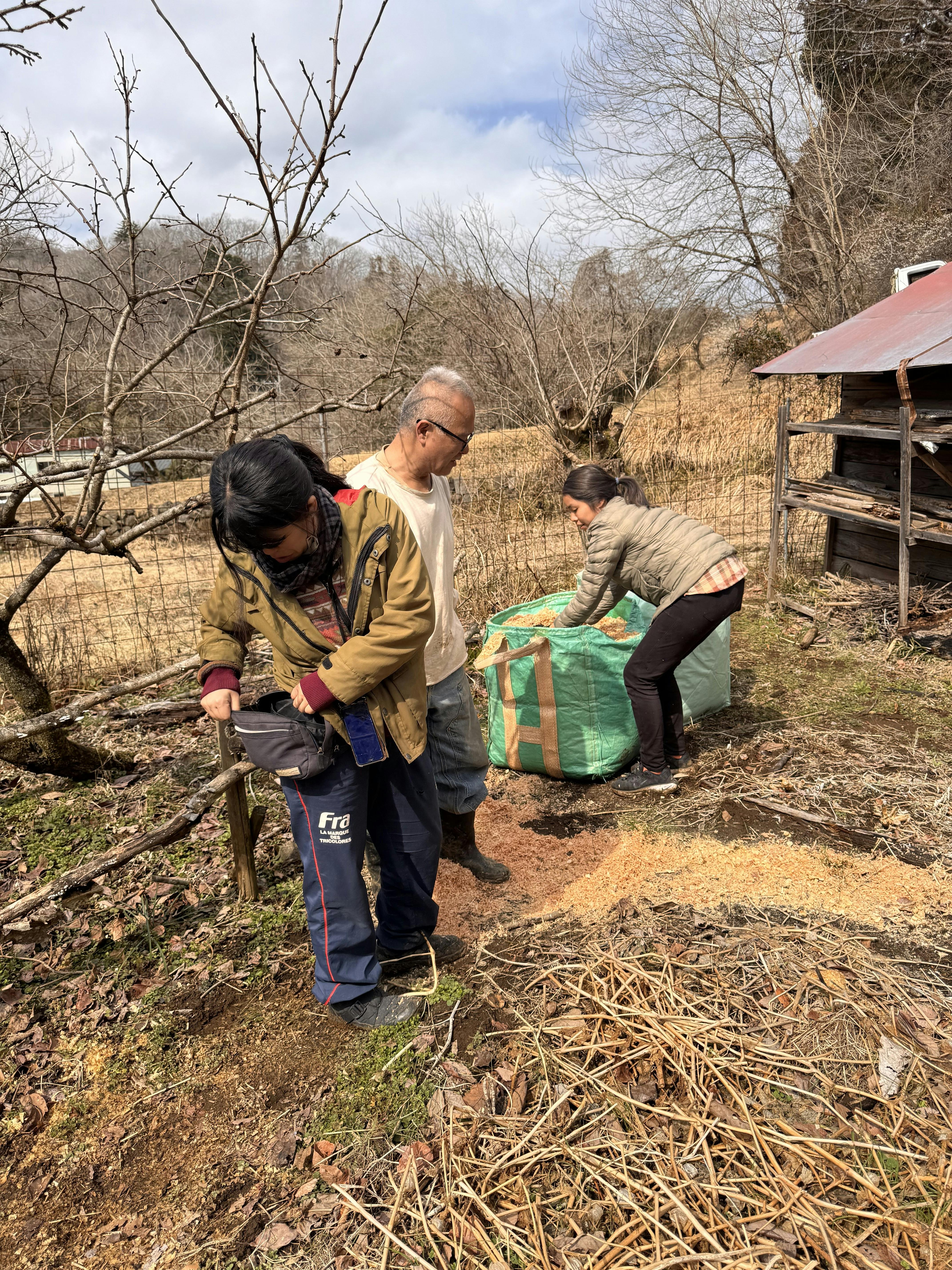 雨上がりということで小道がぬかるんでいましたが、そこにおが屑をまきました。おが屑を厚くまくことで、土に炭素が行き渡り、土壌改善になる上、雑草も生えてこなくなります。そして、歩くときのぬかるみが減る!見た目もなんだかオシャレ!おが屑のよい香りもしました^^