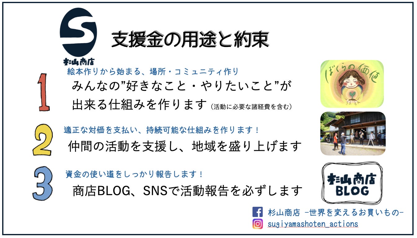 そしてこのプロジェクトを機に、「杉山商店ー世界を変えるお買いものー」(Instagram)を立ち上げ、クラファン後もこの活動を事業として続けていくつもりです。これは資金の使い道を明確化し、きちんとやる覚悟を示す意味も込めており、僕はこのプロジェクトを真剣に盛り上げたいと思っています。